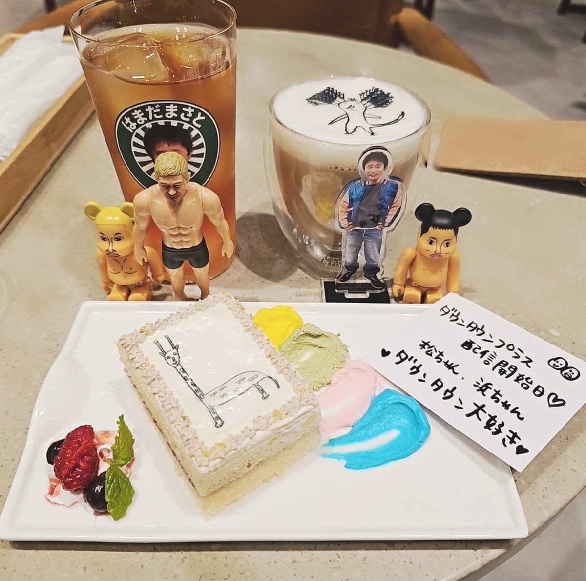 ご迷惑にならないようにこっそり紙を置いて1人お祝いケーキしてきた✨ 店内BGMも有難い事に今回もゲイシャガールズの時にあたって、周りもダウンタウンファンで混みあってて、あーーー幸せだねえーーー✨✨って噛み締めてきた🥹✨ #はまだまさとティー #空を横切る飛行雲 #ダウンタウンプラス pic.x.com/2CfSh0L3pN