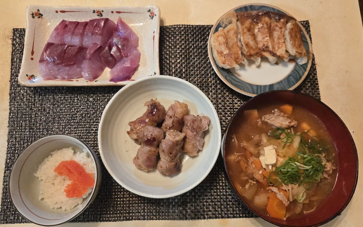 今日のばんごはん はまちのお刺身 餃子🥟 肉巻き餃子 ごはん 根野菜盛りもり 豚汁🐽 お椀のデカさはお約束 (*´˘`*)๗−๒(´˘`*)ヤクソク めしあがれ (ᯫ᳐ ॢơˬơ ᯫ᳐)どーぞ.ᐟ #おうちごはん #はまちのお刺身 #肉巻き餃子 #根野菜盛りもり豚汁 pic.x.com/cFPbVinUnv
