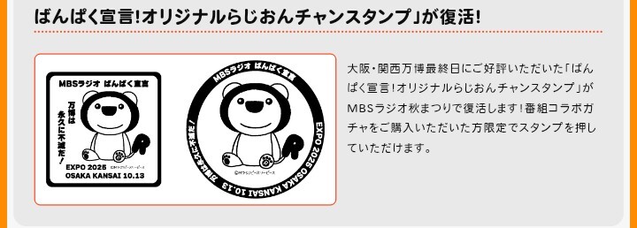 MBSラジオ・ばんぱく宣言(その他) calbeecard1973.blog.fc2.com/blog-entry-43.… 万博閉幕日の1日だけ押せた限定スタンプが本日のMBSラジオまつりで復活!今後もイベント等で押せる機会があるかもなので要チェックです! #大阪関西万博 #万博スタンプ #MBSラジオ #ばんぱく宣言