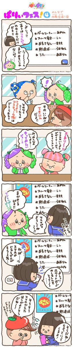 ⭐️ぱりぃグミ!!⭐️四コマまんが🖊️️ みんなの役割が決まってあとはマスカピォの役割だけ!🎉✨ マスカピォはいったい何の役割をするのかな~~??👗✨🌈 #漫画が読めるハッシュタグ #四コマ漫画 #ぱりぃフェス pic.x.com/srI1ZCbVCs