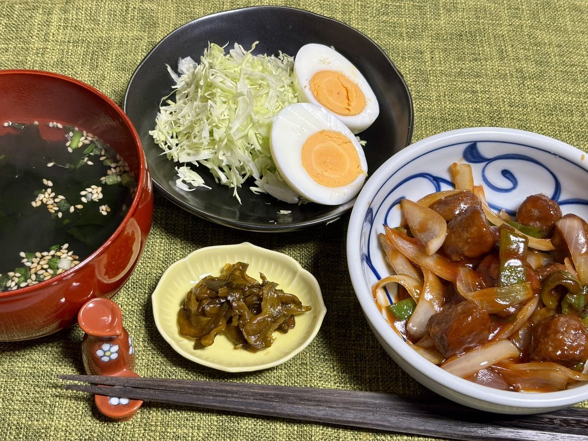 🥃休肝日🚫 🫑ピーマン、🧅玉ねぎと  🐷ミートボール🐤の  炒めもの  (イシイのミートボール使用) 🥬千切りキャベツ 🥚茹で卵 🥒ピリ辛キュウリ わかめスープ 🍚白飯 🐈🐈🐈 #晩ごはん #ひとりごと pic.x.com/9GC27Ora1s