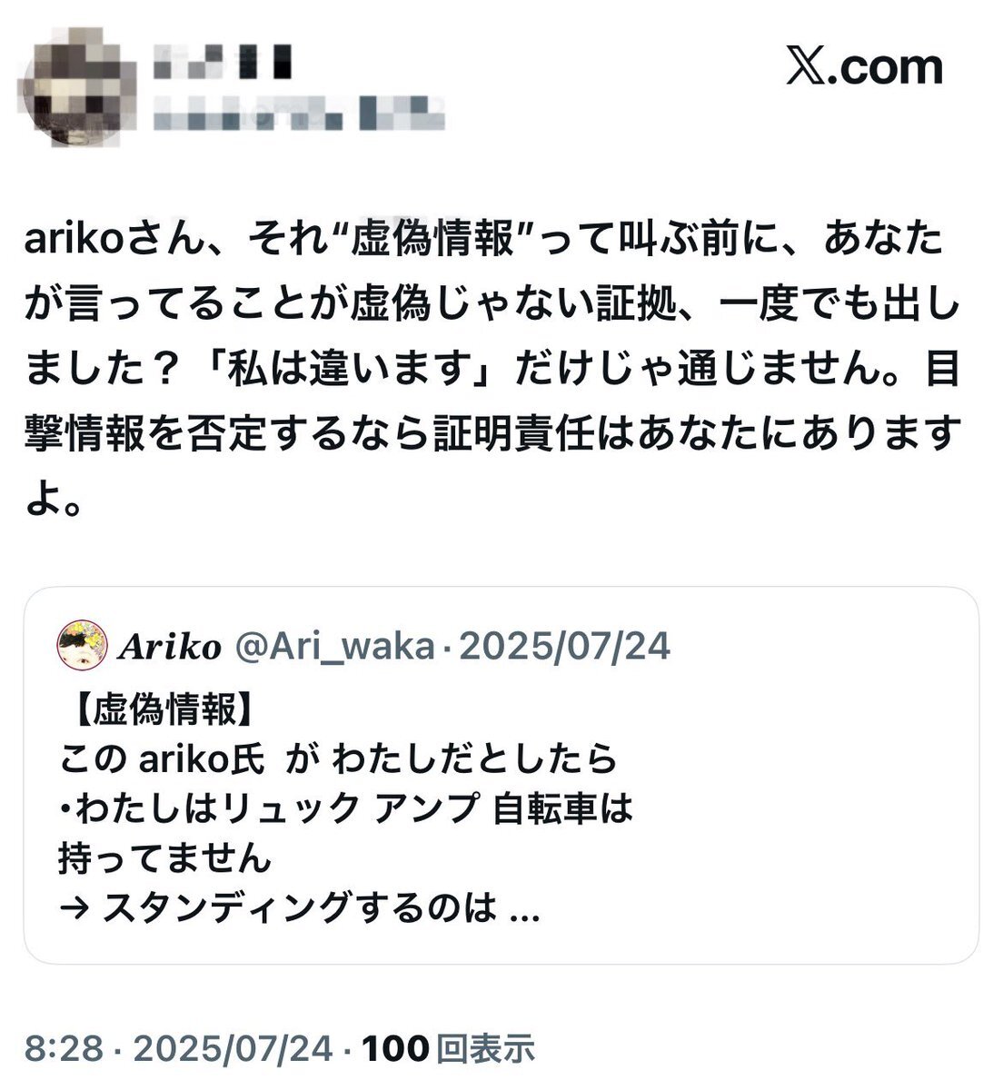でも 残念ながら 「職質されてない」って証拠出せなかったんだよね ( #ひとり街宣 #ひとりスタンディング)だから 「わたしは違います」じゃ通じないんなら この方に 「Arikoが職質されたのは事実」っていう証拠を出して欲しかったな 目撃情報が正しいっていうなら 説明責任はあなたにありますよ pic.x.com/H7jCcVslYp
