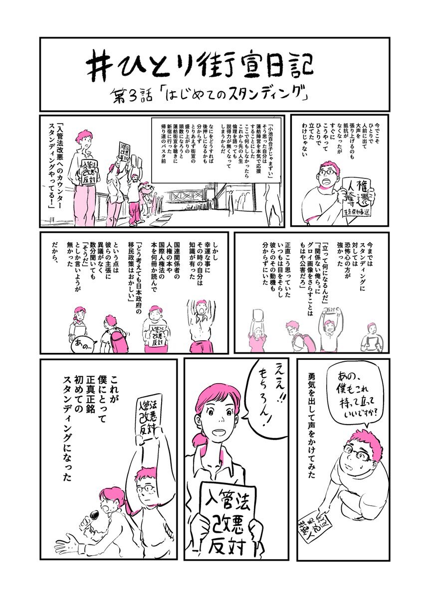 僕の社会運動で初めてスタンディングした時の漫画もよかったら見て 人生初のスタンディングは蓮舫の街宣の頭数になりに行った帰り道の新宿南口での入管法改悪反対スタンディングでした