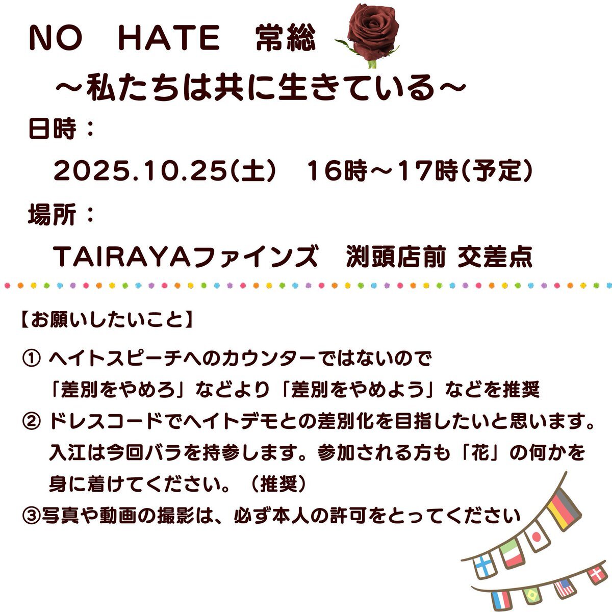 お知らせ 10/25 茨城県常総市にて差別反対の街頭活動 「NO HATE 常総~私たちは共に生きている~」 を行います。 日時:10/25 16時~17時 場所:TAIRAYAファインズ渕頭店前交差点 ・国道294号に沿ってスタンディングで宣伝行動をします。(続