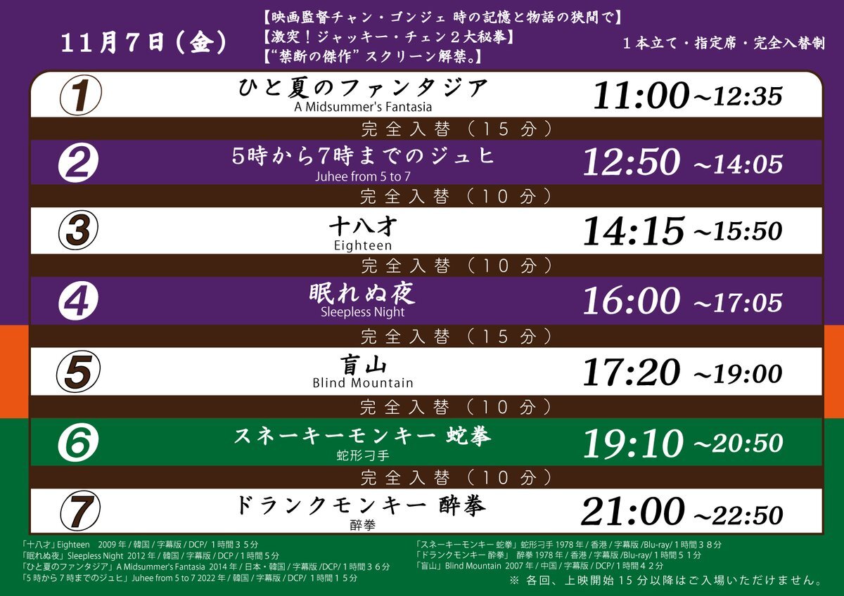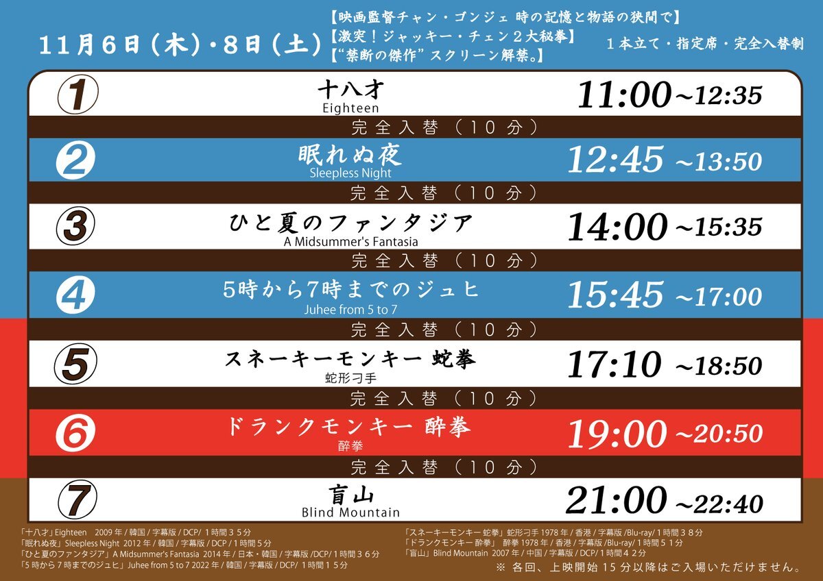 【🇰🇷最終日です🇰🇷】 📅11/8㊏ 映画監督 #チャン・ゴンジェ#十八才』 『#眠れぬ夜』 『#ひと夏のファンタジア』 『#5時から7時までのジュヒ#ジャッキー・チェン 2大秘拳 『スネーキーモンキー #蛇拳』 『ドランクモンキー #酔拳』 『 #盲山 』 🎦1本立て 🎟️ご予約⇒x.gd/Pvu7J pic.x.com/hbJtqCIBqD