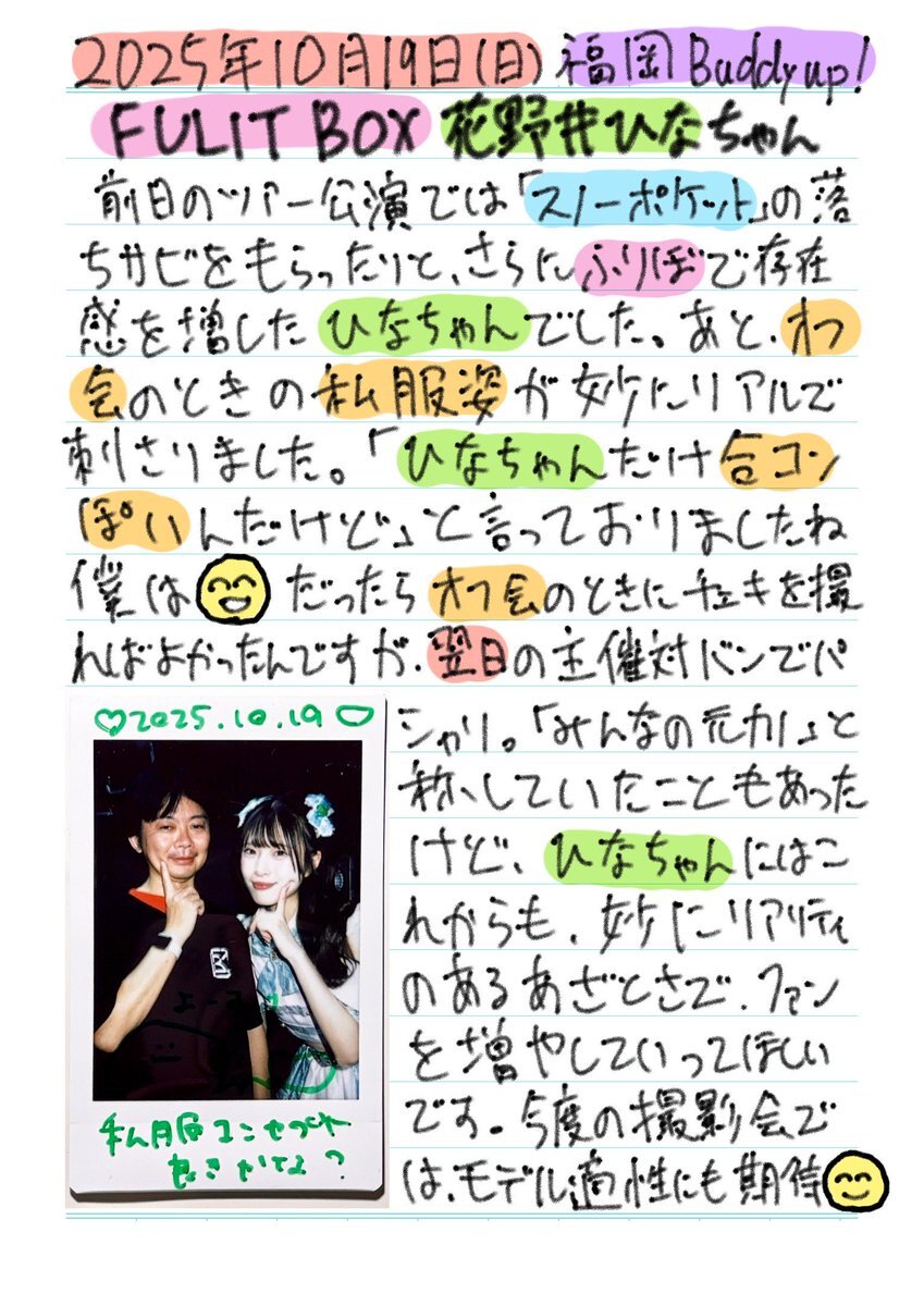 今年EASTワンマンライブを見たグループが相次いで解散・活動休止することになって、ひなちゃんとチェキを撮るきっかけになってた、はないさんもはなのいさんも年内でいなくなってしまうということで僕はあまり元気ないです🥺 なのでその分ふりぼちゃんには期待してますよ💚 #ひなちゃんよしよし界隈 pic.x.com/VmCM7ZxrTy