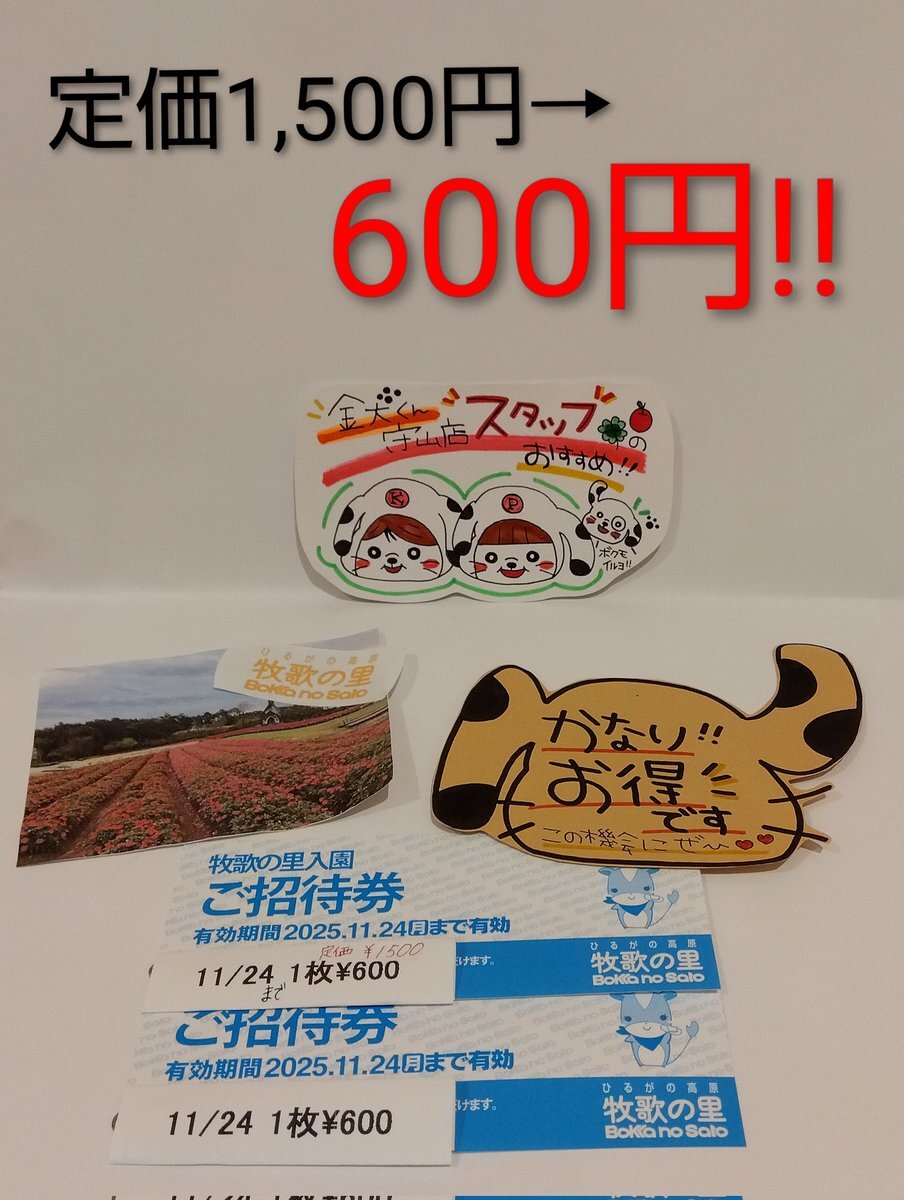 こんにちは🤗 行楽シーズンですね✨ 牧歌の里 入園ご招待券をお預かりしました🌷 素敵なお花畑や動物と触れ合えるコーナーもあるそうですよ🥰 お値段もかなりお値打ちです😻 早い者勝ちです🌟お急ぎください〜💨 金犬くん守山店🍀かど🍀 牧歌の里 bokka.co.jp