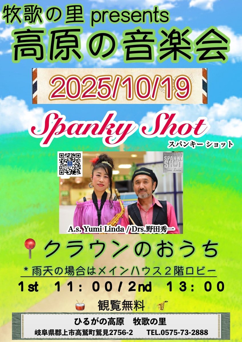 2025年10月19日 🔰📍ひるがの高原 牧歌の里 お待ちしております🤗 ご事情・ご都合が許すようでしたら、足をお運びいただけると幸いです☘️ #ひるがの高原牧歌の里 #高原の音楽会 #SpankyShot #スパンキーショット #野田秀一 #YumiLinda #ドラム_サックス_音源_ユニット #インスト #東海地区中心 pic.x.com/kBLafHrM1h