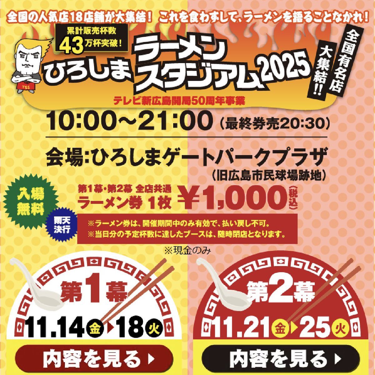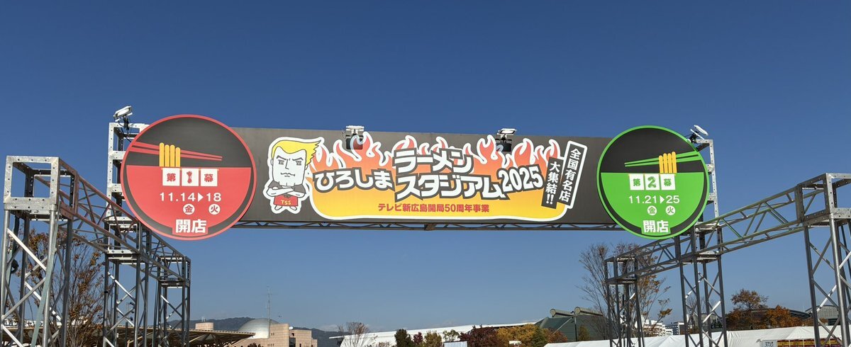 #ひろしまラーメンスタジアム 2025開催中/ 第1幕は本日11/18まで、第2幕は11/21〜25まで #ひろしまゲートパーク で開催! 皆さん、ラーメンお好きですか🍜 ランチ後なので食べられませんでしたが、美味しそうでした…😋スイーツのお店もあり🍮 ✅tss-tv.co.jp/ramen-stadium2… #広島イベント #グルメ pic.x.com/CnsanbgNJN x.com/tss_tv_officia…