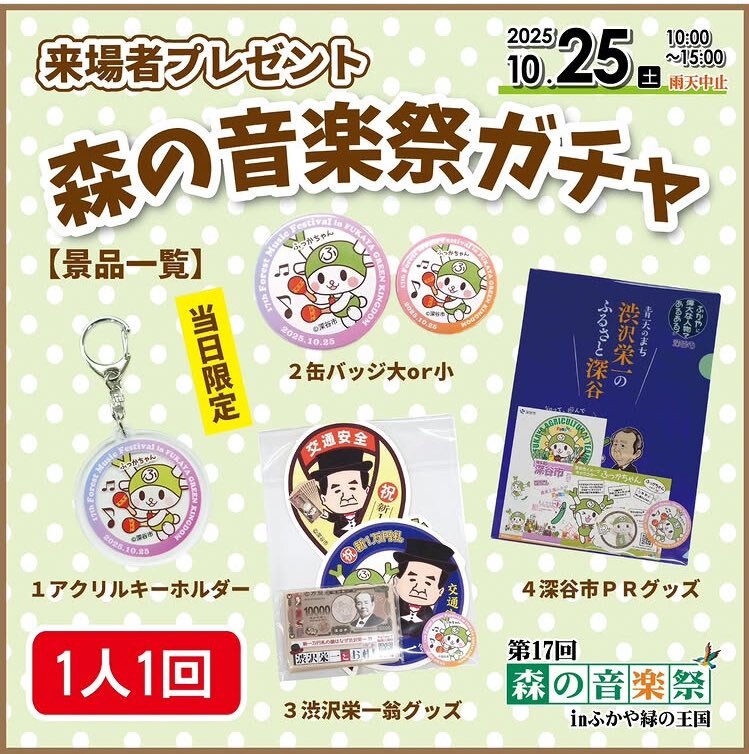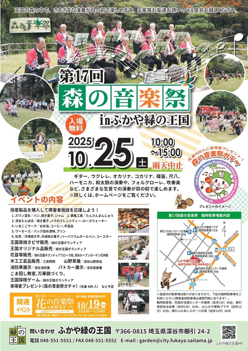 【いよいよ今週土曜日!】 今年も出演させていただきます🙇♀️入場無料、AとBの2つのステージで多彩な生音が聴けます🌳我々はAステージ11:45~出ます 素敵な秋の王国のお庭も楽しんでくださいね!来場者プレゼントや授産施設と王国の飲食物品販売もあり🙆♀️ #ふかや緑の王国 #森の音楽祭 pic.x.com/HdRSrQr9Lr