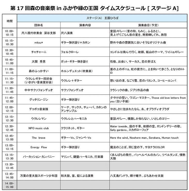 10月25日(土)開催の『第17回森の音楽祭inふかや緑の王国』の演奏順と各団体の演奏予定曲です。 興味のあるものを見つけて、ぜひ聴きにお越しください! #森の音楽祭 #ふかや緑の王国 #深谷市 pic.x.com/11JeHow5db