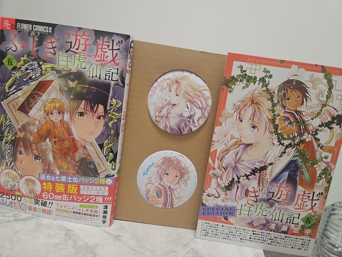 ふしぎ遊戯の特装版が無事に届きました! 缶バッジの入れ物がまるで単行本みたいで一緒に飾れて大満足☆ さっそく5巻を読みました、やっぱ青竜の心宿みたいにネイランも根っからの悪ではないし、なんていうか普通に年頃の女の子なんだよね… 先生!敵キャラ魅力的すぎます! #ふしぎ遊戯白虎仙記