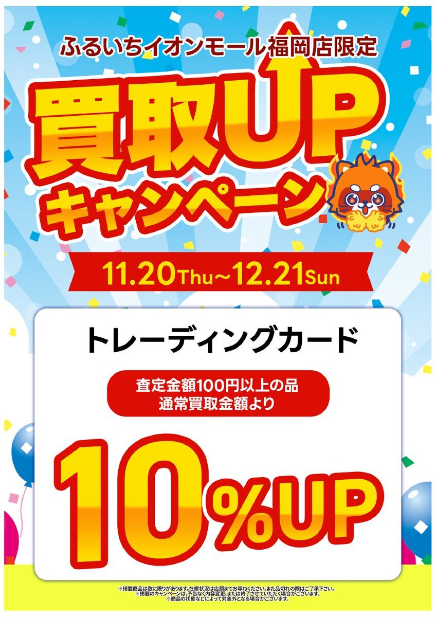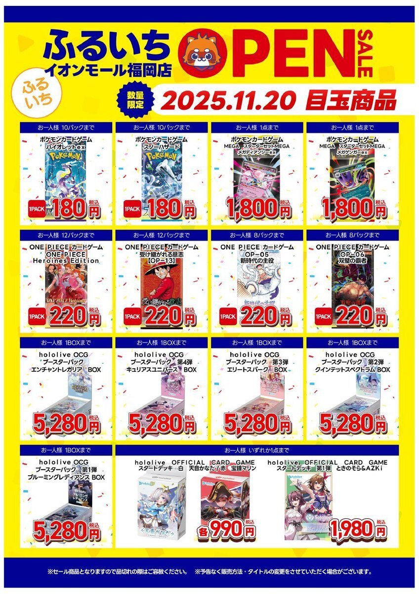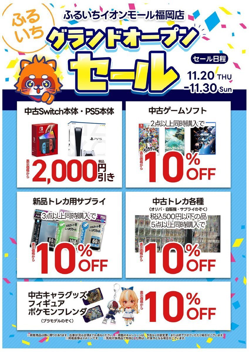 【#グランドオープンセール!!】 #ふるいちイオンモール福岡店 です!! 本日は11/20(木)より開催のセールについてご案内します!! 🔴中古 #トレカ 税込500円以下の品5点以上同時購入で10%OFF 🔵新品 #トレカプライ品 3点以上同時購入で10%OFF などお買得盛りだくさんです!! 11/20はぜひふるいちまで!! pic.x.com/3s6NKJk5KL