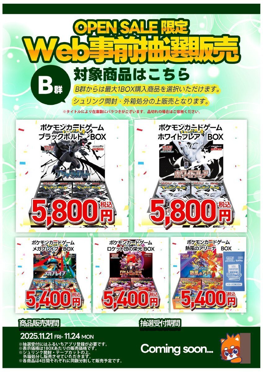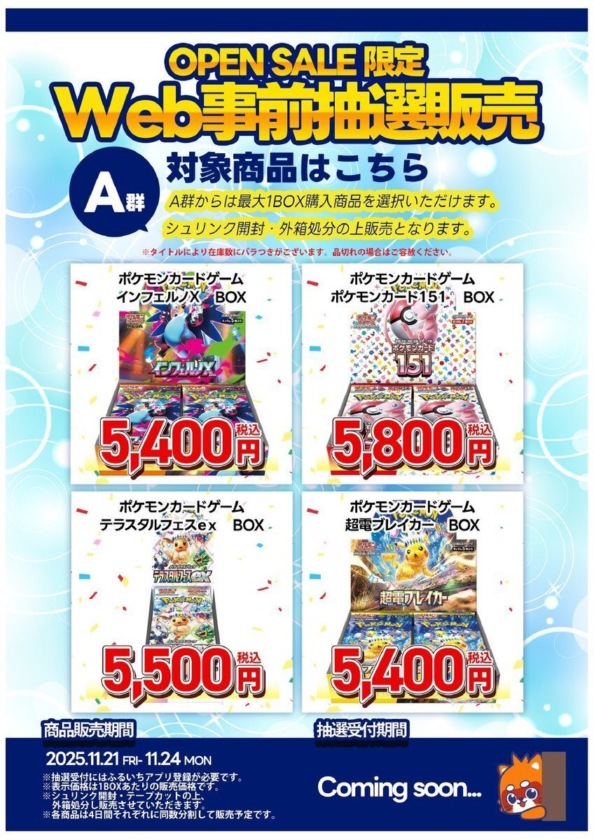 21日の金曜日の抽選に当たったんだけど😳 割と早い順番で回ってくるけど、流石に151は残ってなさそう😌 それぞれの群で1種ずつ買えるみたいなんですけど、視聴者様は何の開封が見たいですか? 希望のパックが残ってたら買うようにします✨ #ふるいちイオンモール福岡店 pic.x.com/YCifgaAabT