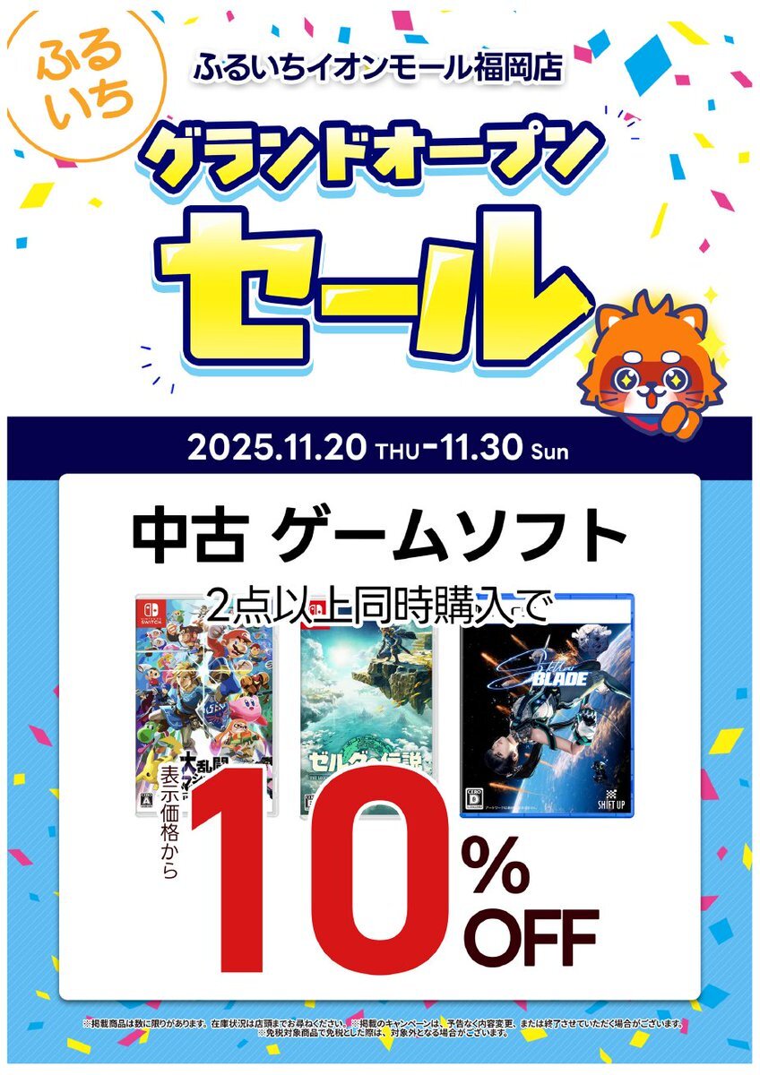 【#グランドオープンセール!!】 #ふるいちイオンモール福岡店 です!! いよいよ今週木曜日オープン!! セールについてご案内!!! 🔴中古 #Switch本体・#PS5本体【表示価格から2,000引き!!】 🔵中古 #キャラクターグッズ【表示価格から10%OFF!!】 目玉商品もご用意してます!! 11/20はぜひふるいちまで!! pic.x.com/yCH23fvxjz