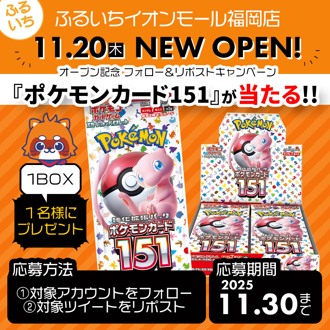 ◤ ̄ ̄ ̄ ̄ ̄ ̄ ̄ ̄ ̄ ̄ ̄ ̄ ̄ #ふるいちイオンモール福岡店 #フォローリポストキャンペーン ______________◢ #ポケモンカード【#ポケモンカード151】1BOXが抽選で当たる!? ①@furu1tenpoと@furu1_AMfukuokaをフォロー ②このポストをRP 応募は11/30まで 規約▶furu1.net/follow-campain pic.x.com/X6ifJJMNum