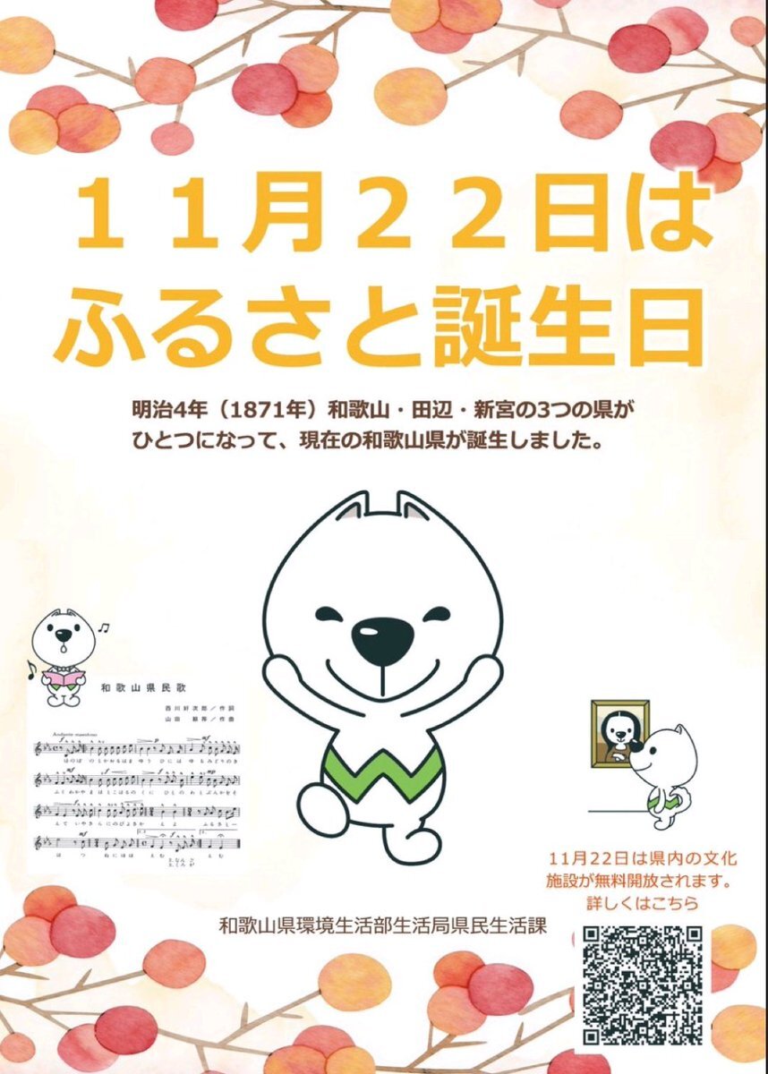 #ふるさと誕生日#和歌山県 ) 11月22日は #和歌山県 の「 #ふるさと誕生日 」です。 #和歌山県 が1989年に「ふるさと誕生日条例」で制定しました。1871年( #明治 4年)のこの日、 #和歌山#田辺#新宮 の紀州3県の統合により現在の #和歌山県 が誕生したことに由来しています。