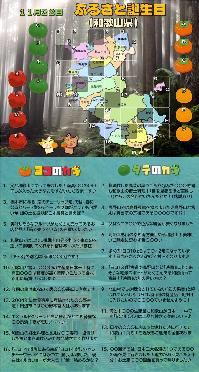 おはようございます! 今日は #和歌山県 の #ふるさと誕生日 1871年の今日、和歌山・田辺・新宮の紀州3県の統合により現在の和歌山県が誕生🎂✨ 魅力的な場所がいっぱいある和歌山県に訪れてみたくなりました☺️♡ ふるさとを愛せる1日になりますように🍊✨ #クロスワード #パズル #今日は何の日