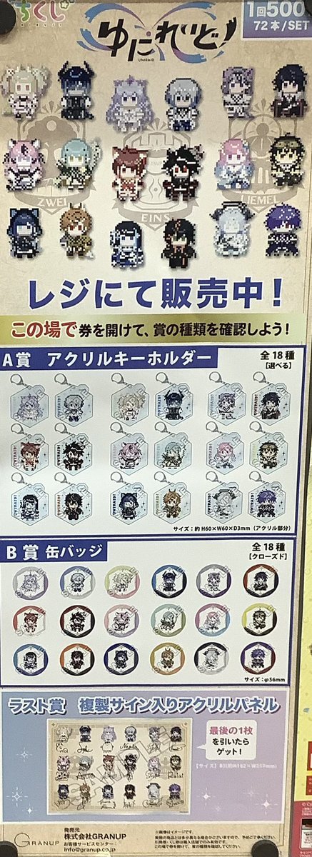 #ぷちくじ ゆにれいど! 好評発売中! A賞アクリルホルダー、B賞缶バッチのお手頃くじとなってます! ラスワンは複製サイン入りののアクリルパネル! 推しを狙っている方はお早めに! #ゆにれいど x.com/GRANUP_PR/stat…