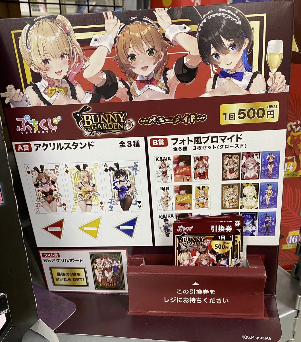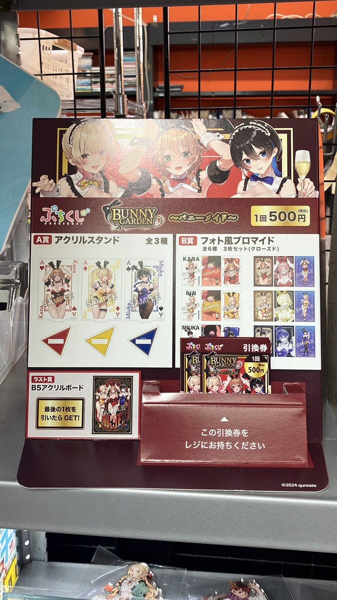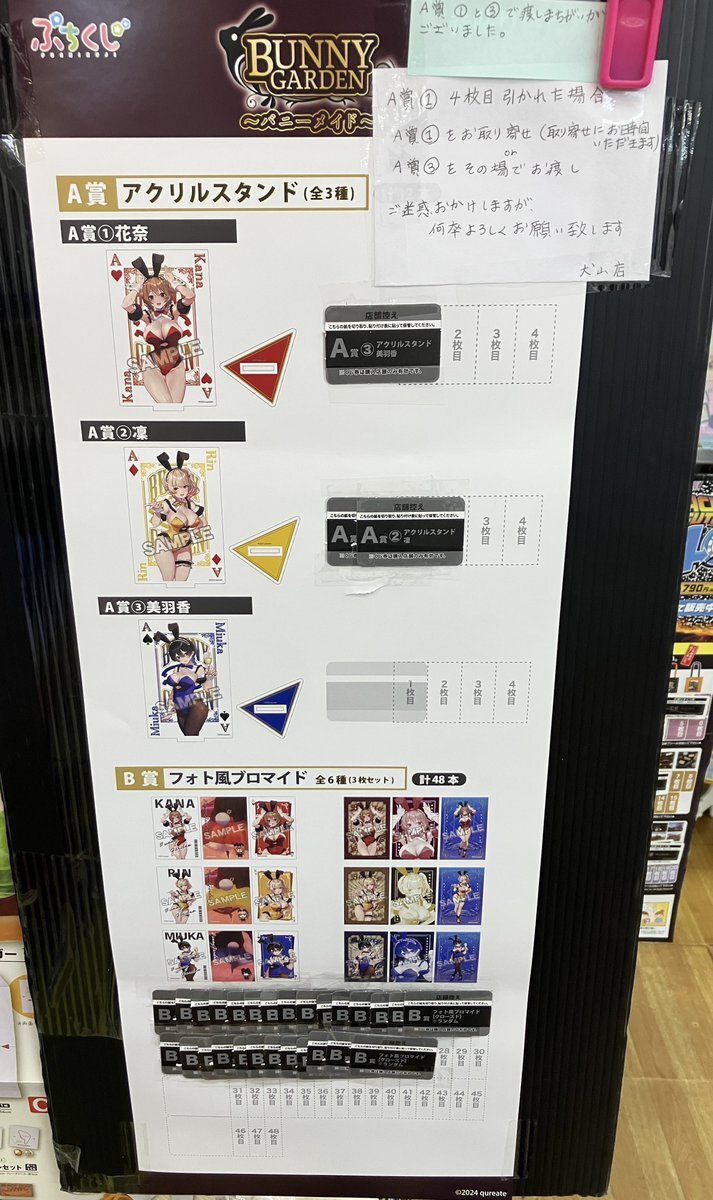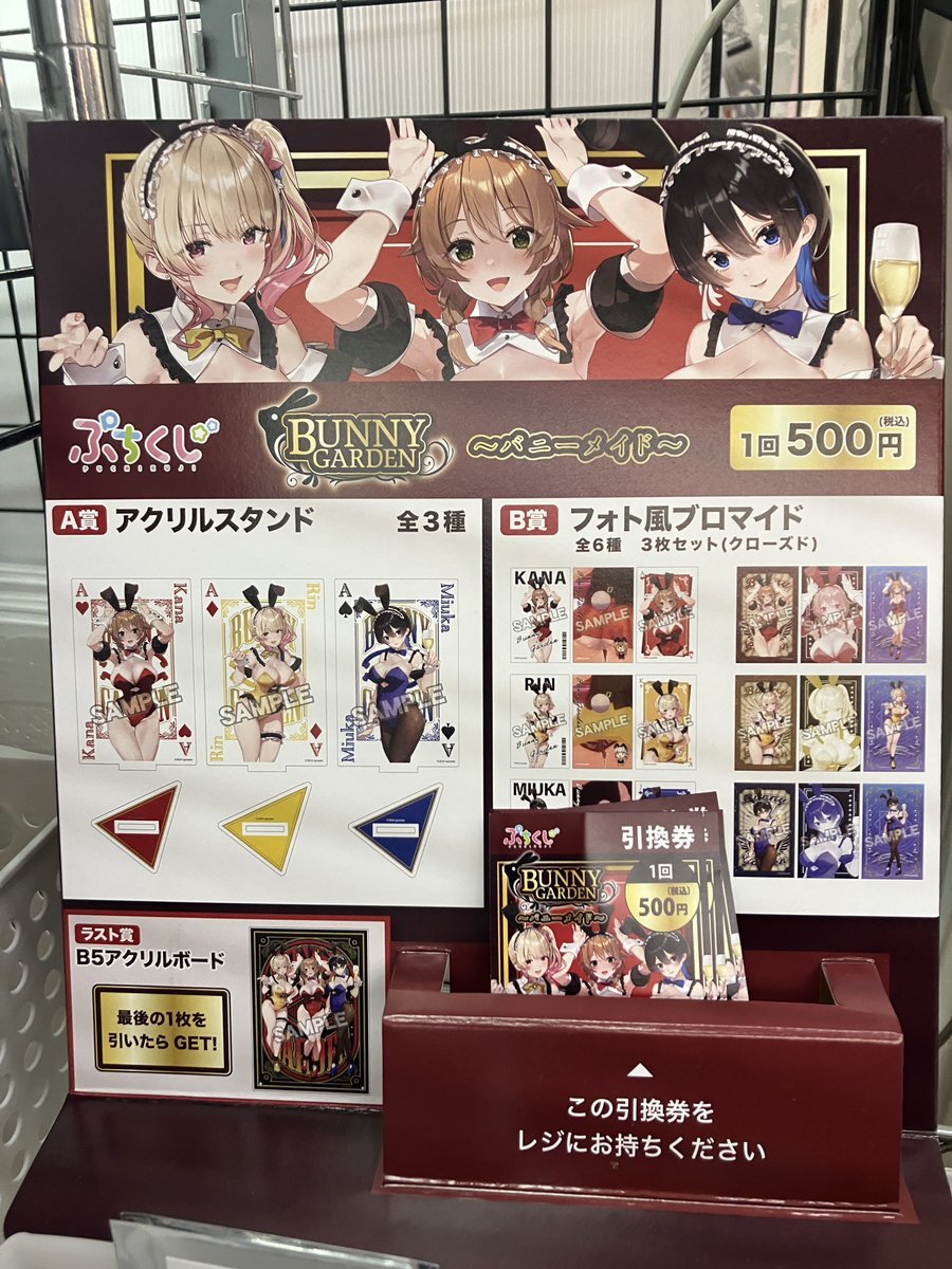 【 #ぷちくじ 消化情報】 #バニーガーデン #bunnyGarden バニーメイド 1回税込500円 残り30口 A賞 ①花奈 3点 ②凛 2点 ③美羽香 4点 残っております‼️ チャレンジお待ちしております💪✨ #ブックタウン犬山五郎丸店 pic.x.com/YWmeZjLB9M