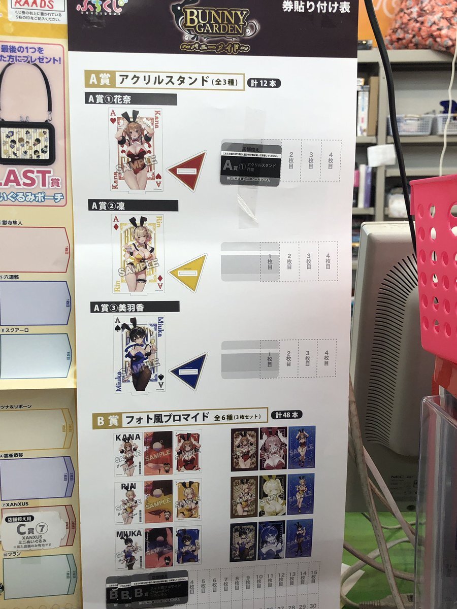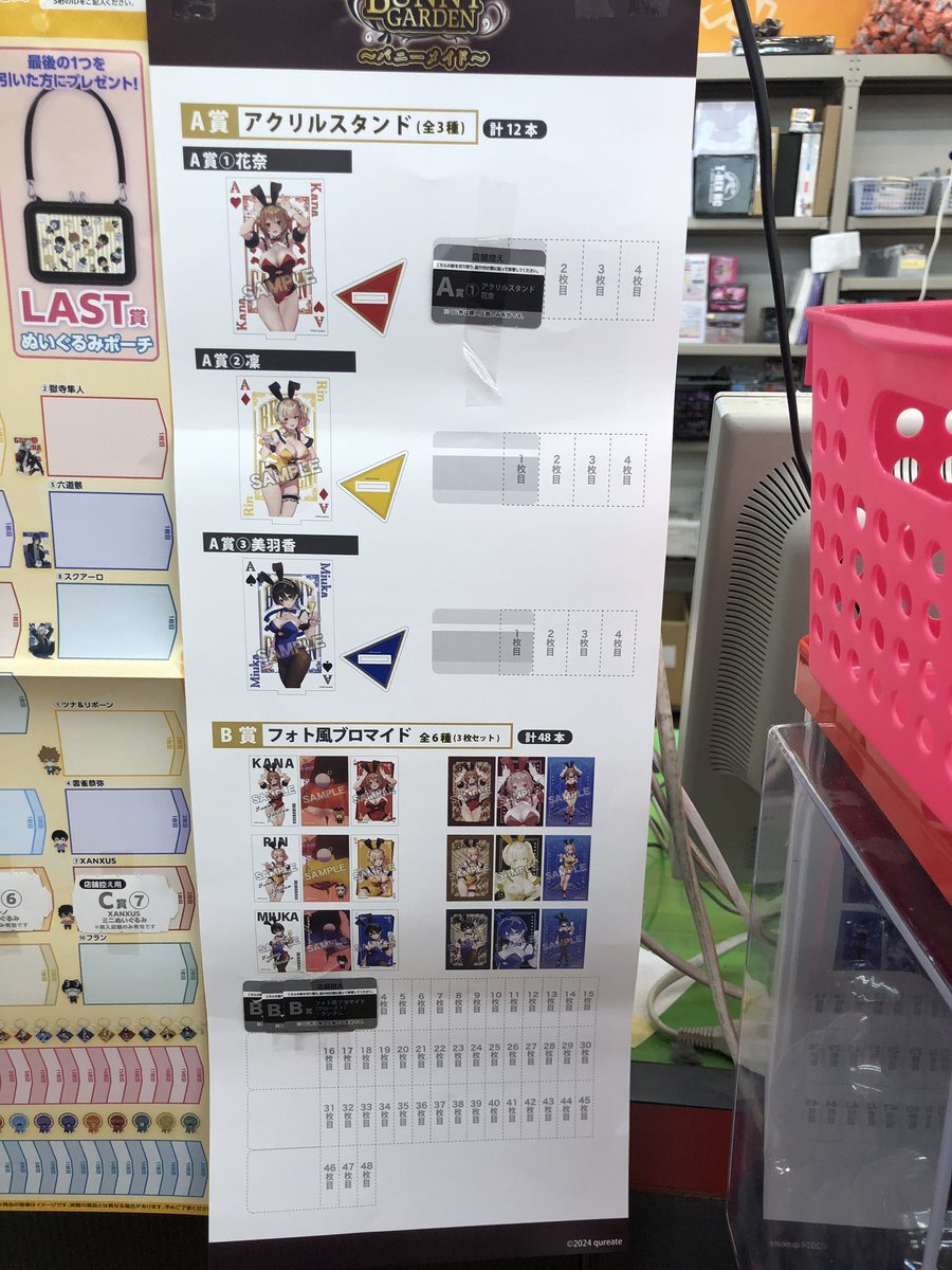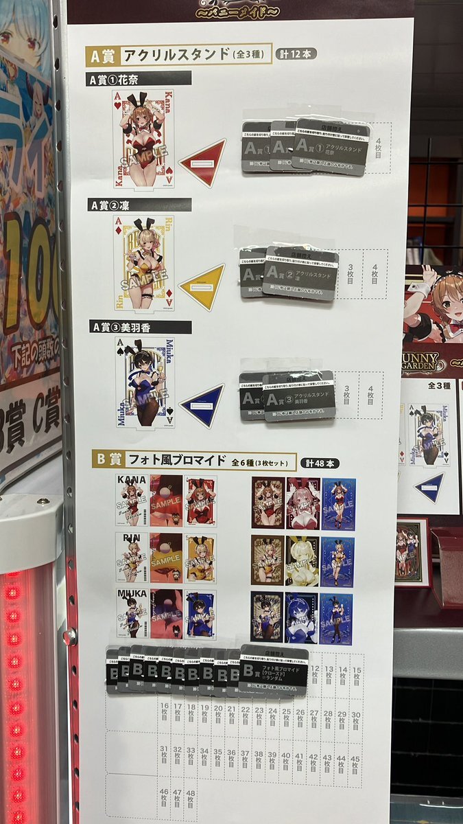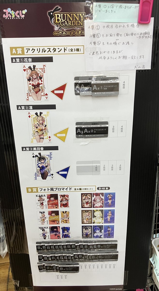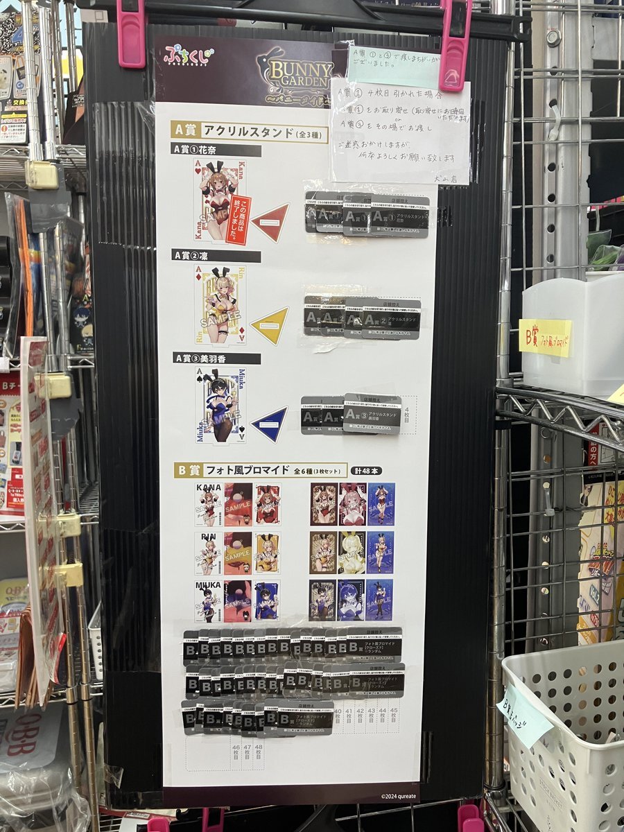 【 #ぷちくじ 消化情報】 #バニーガーデン #bunnyGarden バニーメイド 1回税込500円 残り30口 A賞 ①花奈 3点 ②凛 2点 ③美羽香 4点 残っております‼️ チャレンジお待ちしております💪✨ #ブックタウン犬山五郎丸店 pic.x.com/YWmeZjLB9M
