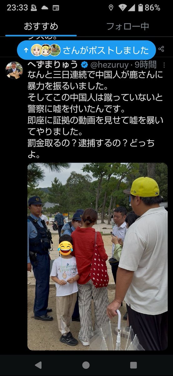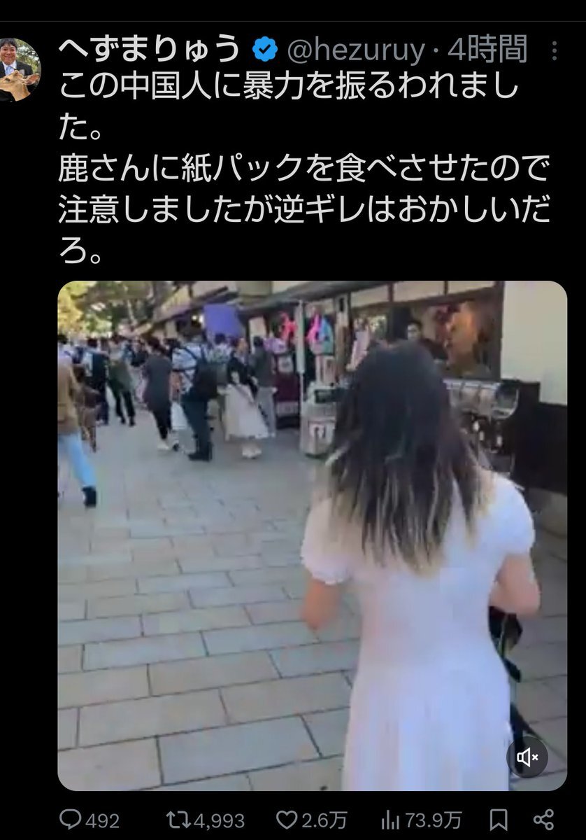 いちゃもんを付けて暴力的な威嚇や脅迫を繰り返すへずまりゅうから外国人を守るパトロールこそが必要なのではないか? 警察はこんな迷惑な人間を放置していてはいけない #へずまりゅう #へずまりゅうから社会を守ろう #奈良の鹿 #奈良公園 #奈良公園の鹿 x.com/hezuruy/status…