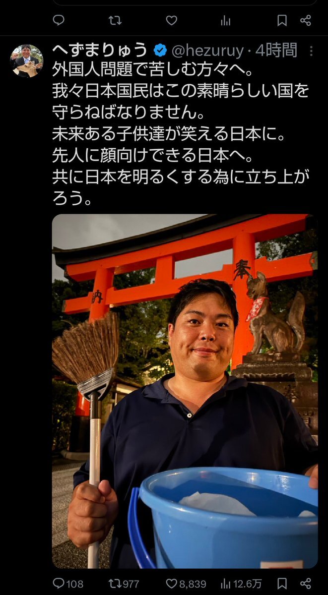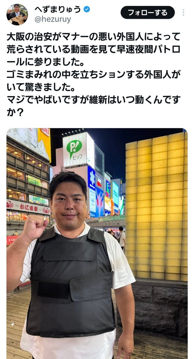 外国人だろうが日本人だろうが人が増えればゴミが増えるのは当然でしょ。 具体的に何がヤバいのか、何でそう思ったのか言わないと何も伝わらんよ。 写真見ても休日に沢山の外国人観光客が来て賑わってる中に頭のおかしい奴が変な格好をして浮いてるようにしか見えん。 #へずまりゅう