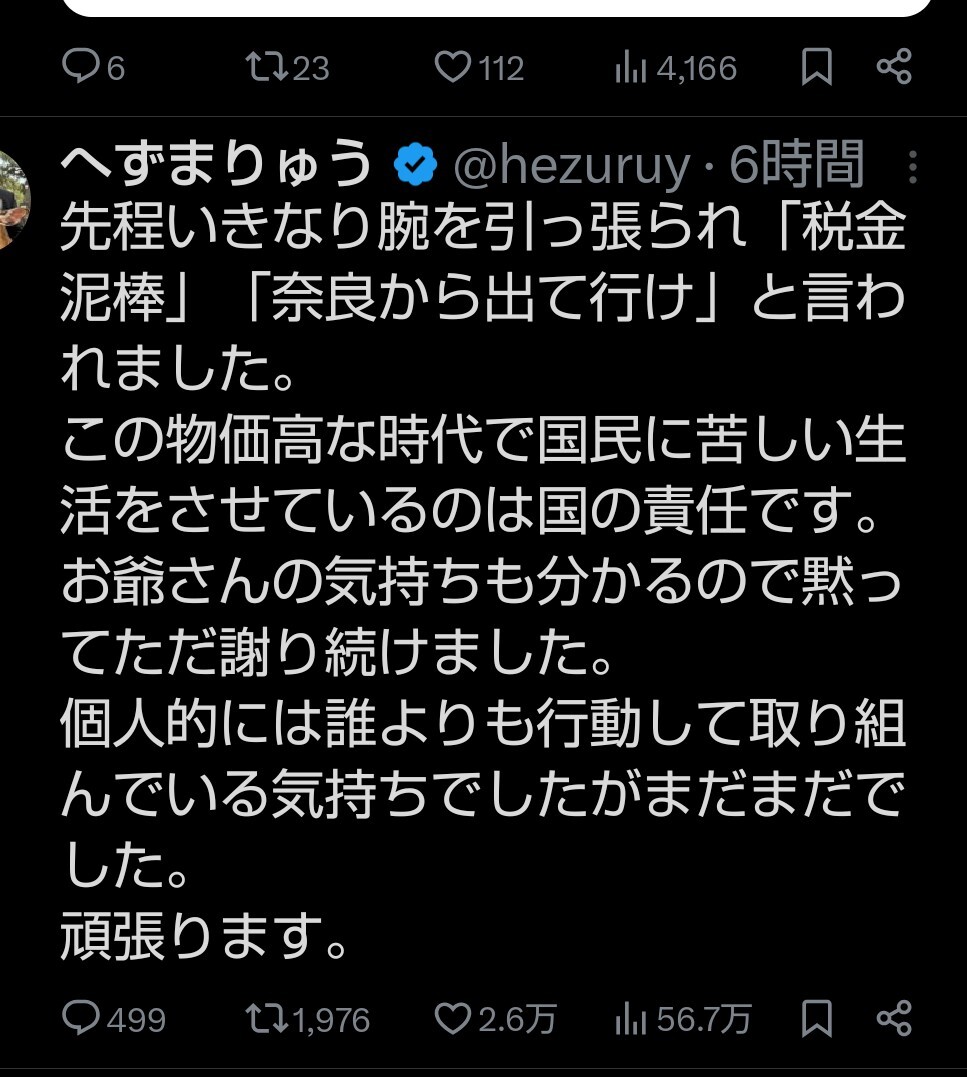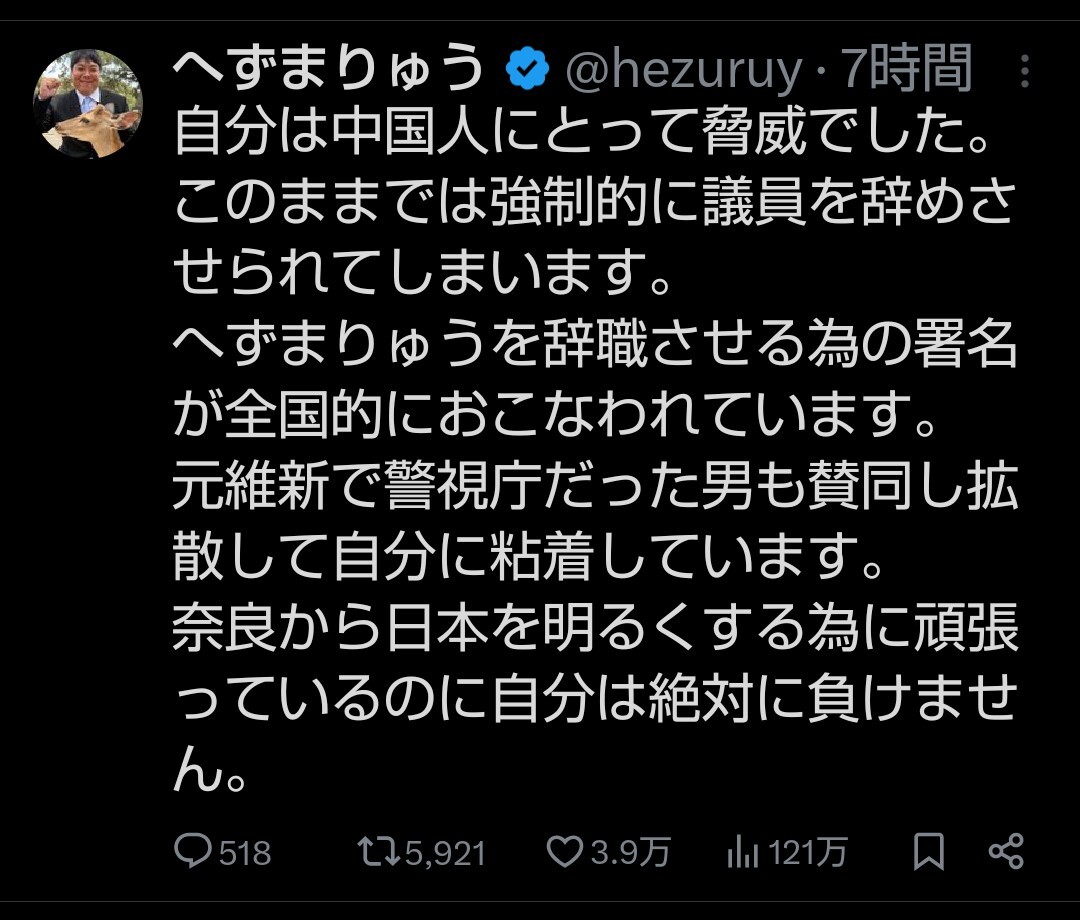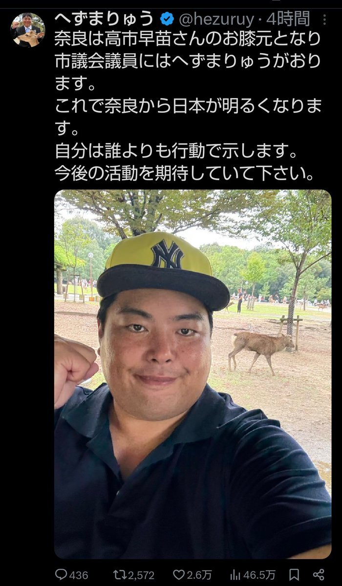 返信先:@hezuruy個人の信条から日本を鎖国化しろ!と訴えるのは全く自由だと思いますが、迷惑YouTuberのスキルを利用して、自分の考えと違う市民や海外観光客を巻き込み、事件を作り、晒す暴力はマジやめろ。世界はあなたの思うように全て回るわけではない #へずまりゅうから社会を守ろう #奈良市議会