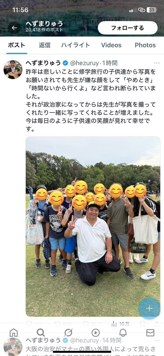 昨年は悲しいことに修学旅行の子供達から写真をお願いされても先生が嫌な顔をして「やめとき」「時間ないから行くよ」など言われ断られていました。 それが政治家になってからは先生が写真を撮ってくれたり一緒に写ってくれることが増えました。 今は毎日のように子供達の笑顔が見れて幸せです。