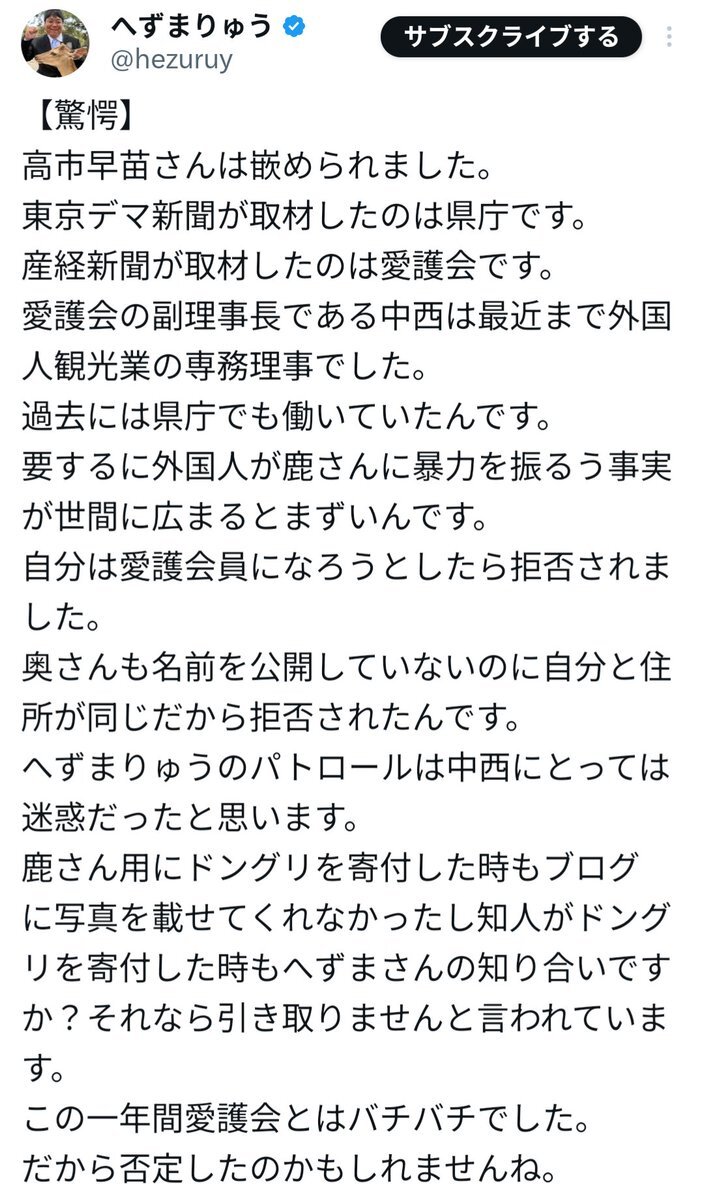 へずまりゅうが鹿を本当に守りたいのなら、長年鹿を見守る活動をしている「プロ」の先輩達から頭を下げてでも学ぶべきだ。それが敵対してどうする。奴は何がしたいのか分からん。 #へずまりゅうから社会を守ろう x.com/arusu752/statu…