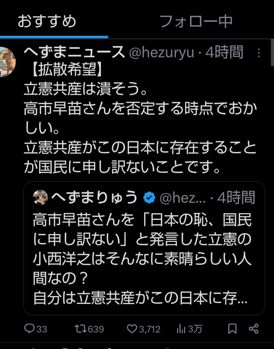 へずまりゅうは立花孝志となんら変わりはない。 それにのる報道番組もいかがかと思うが、へずまや高市氏の煽りにのって真っ当に仕事をしている人を攻撃することは恥ずかしい行為だ。 #へずまりゅうから社会を守ろう x.com/YRalNBPnC85027…