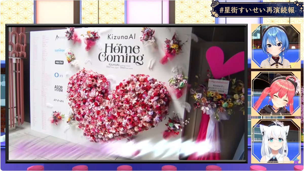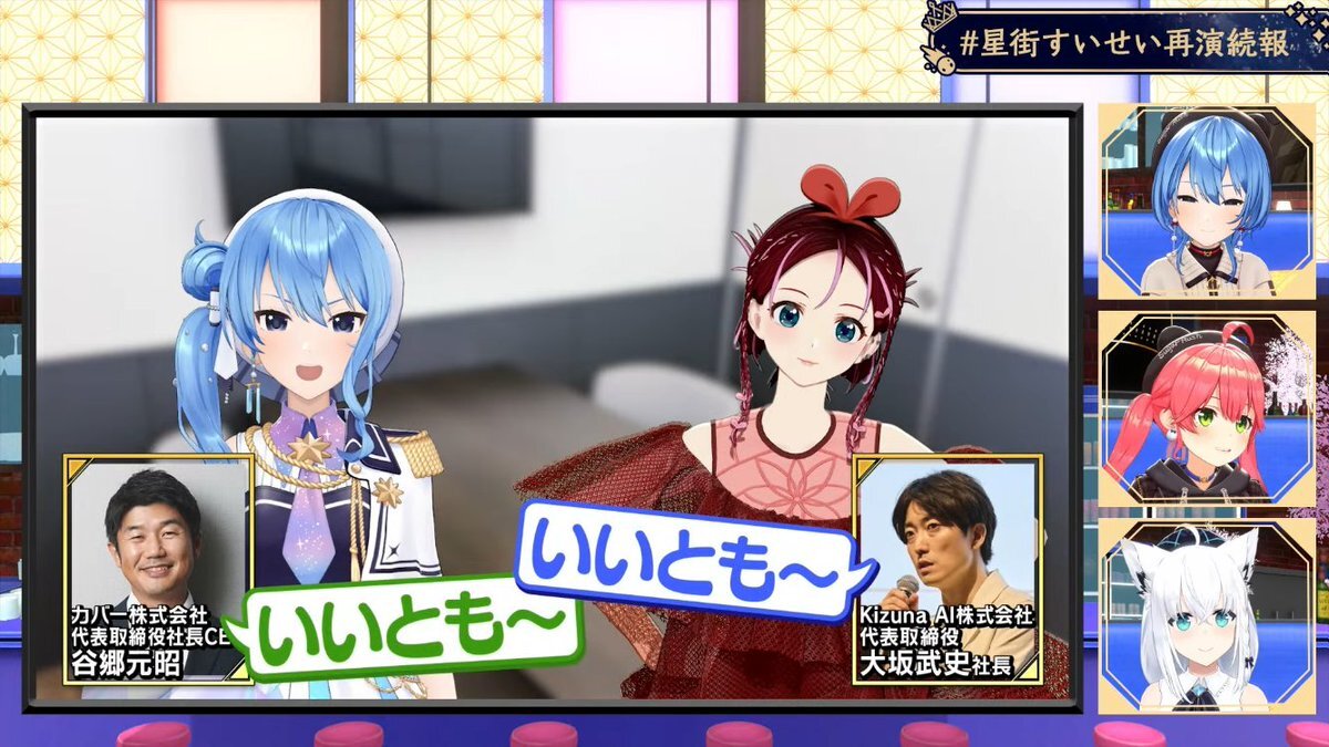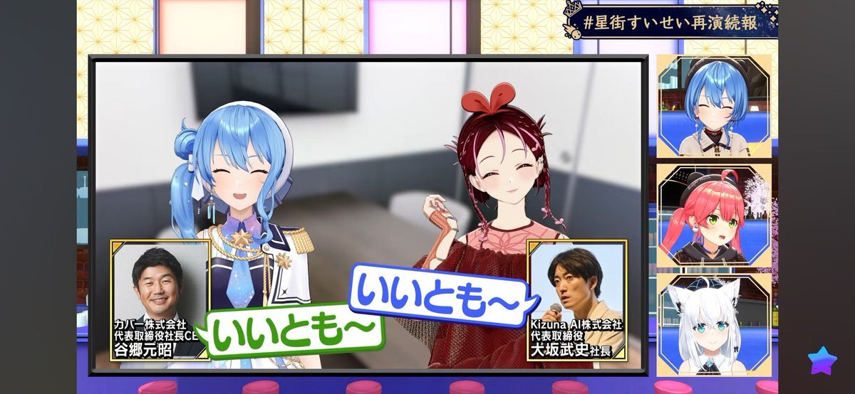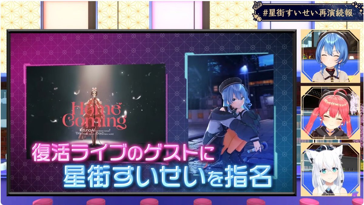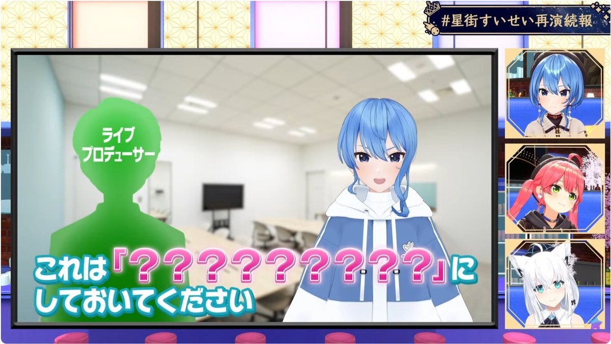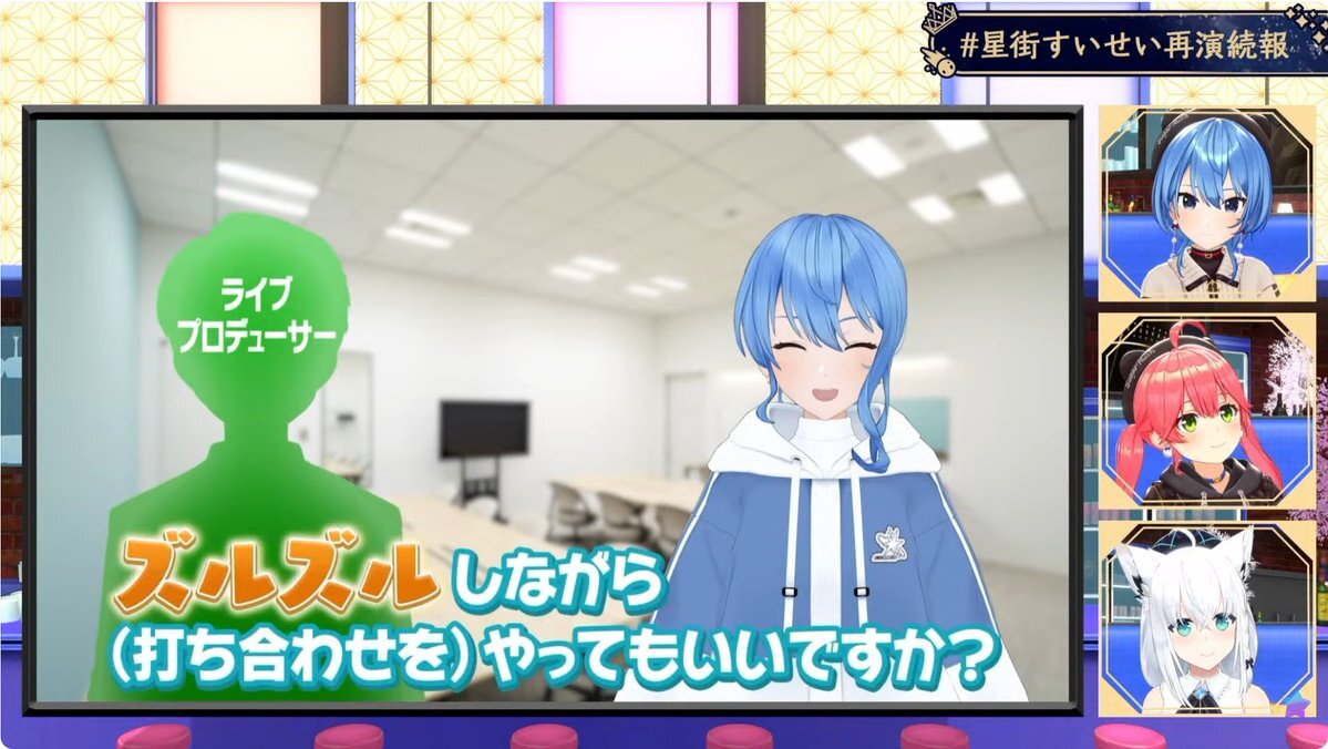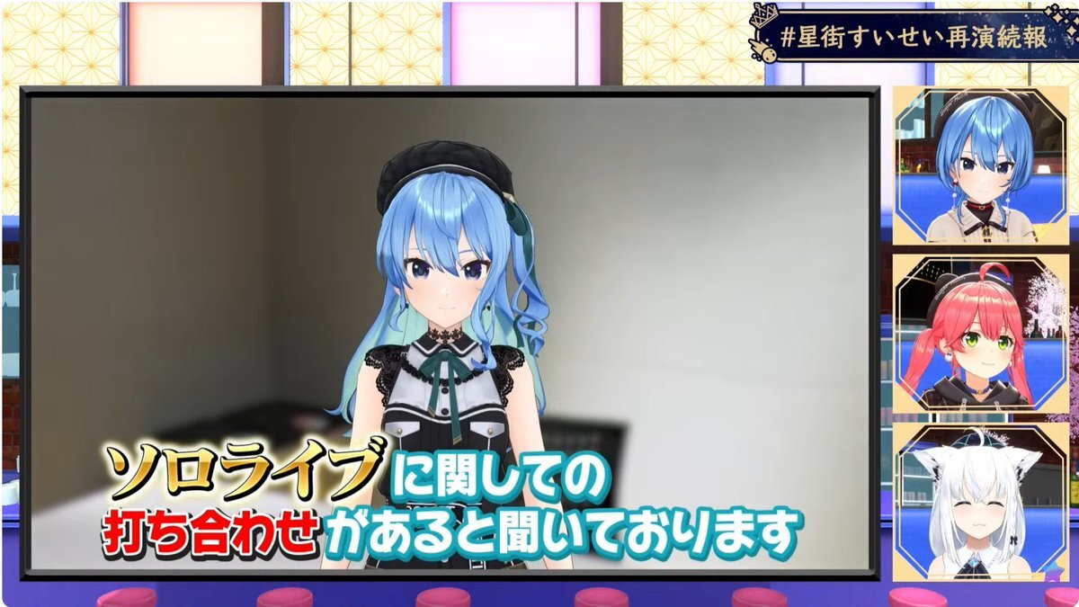 すいちゃんお仕事密着&新情報大量解禁 サンボマスターさんとの対バンライブにキズナアイさんのライブにゲスト出演にホロ花火に自身ライブ打ち合わせ😳凄い 各社長並んでやり取り見てるのおもろすぎw そして大量の新情報!!サイフへの圧…最高!! 受けてたつ!! #ほしまちすたじお #かけめぐるほしまち再 pic.x.com/Vwghd0d0s8
