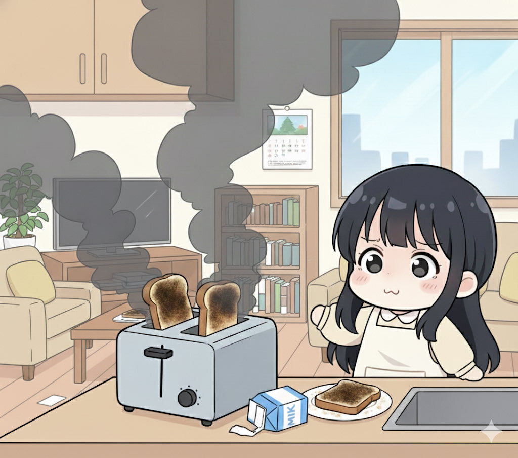 「チーン♪」って音がしたと思ったら…黒いパンが出てきた🥖💨 焦がしちゃったけど、バターの香りは最高! そんなちょっとドジな朝も、笑ってスタート☺️ #ミニキャラの朝シリーズ 2日目🍞#イラスト好きな人と繋がりたい #癒し絵 #朝の失敗談 #ミニキャラ生活 #ほのぼの絵 pic.x.com/RC86GHA2XY