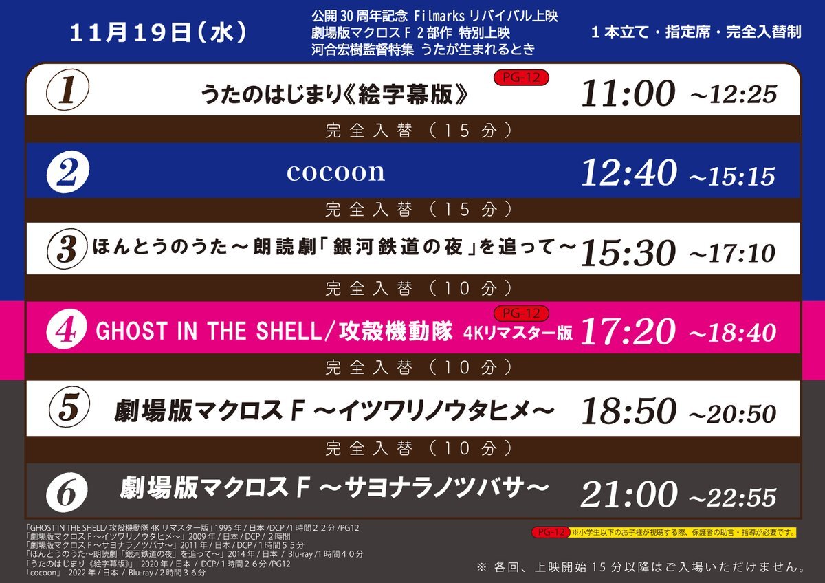 【🩷最終日です💚】 📅11/19㊌ 『GHOST IN THE SHELL/#攻殻機動隊』 『#劇場版マクロスF~イツワリノウタヒメ~』 『#劇場版マクロスF~サヨナラノツバサ~』 『#ほんとうのうた ~朗読劇「銀河鉄道の夜」を追って~』 『#うたのはじまり』 『#cocoon』 🎟️ご予約⇒x.gd/Pvu7J pic.x.com/OfoW76FxHy