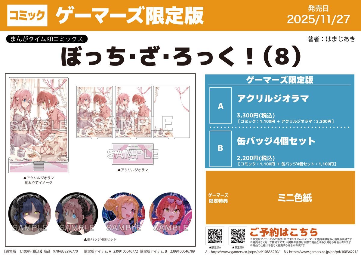 【書籍/予約】 『ぼっち・ざ・ろっく!(8)』 \✨🎸予約受付中🎸✨/ ☑ゲーマーズ限定版A・B A《アクリルジオラマ》 B《缶バッジ4個セット》 ☑️ゲーマーズ限定特典 《ミニ色紙》 来店不要で予約ができる 店舗WEB予約はコチラ🔽 gamers.co.jp/products/list.… #ぼっち・ざ・ろっく pic.x.com/6iId4B6gRh