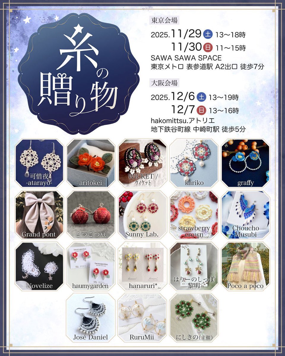毎日にキラメキとトキメキを✨ 色や季節を楽しめるキラキラなアクセサリーを制作しています🌈 【イベント】 ✰︎12/22~30 池袋PARCO #CARAMEL_MUSEUM 【常設委託】 ✰︎@C_CHOCOLAT_C A-77 ✰︎@tokikazari_shop 【通販】 ✰︎~11/19 #宙フェス 夜市オンラインストア(期間限定) #ぼっち企画展 pic.x.com/VRW5STUZ0J