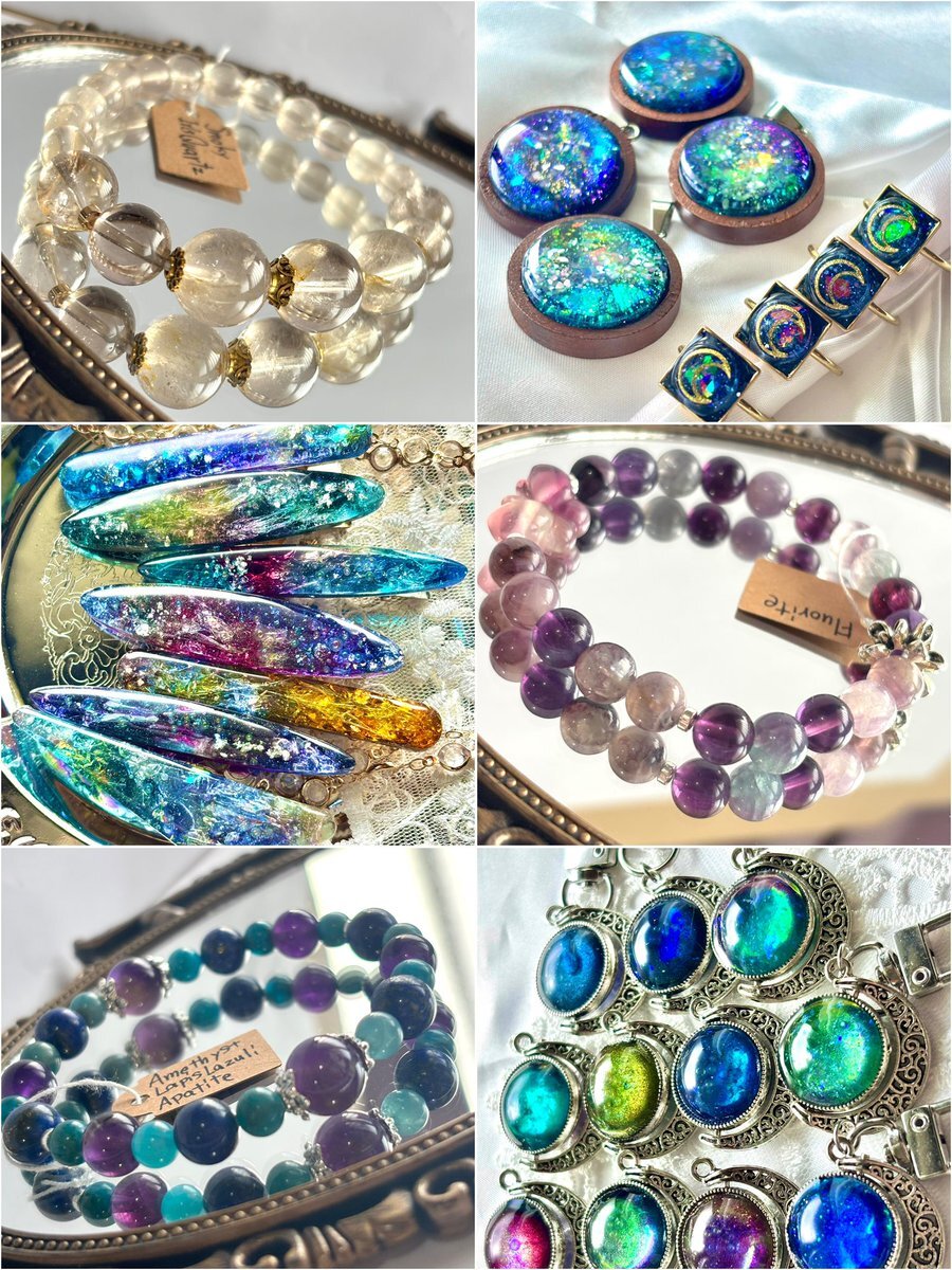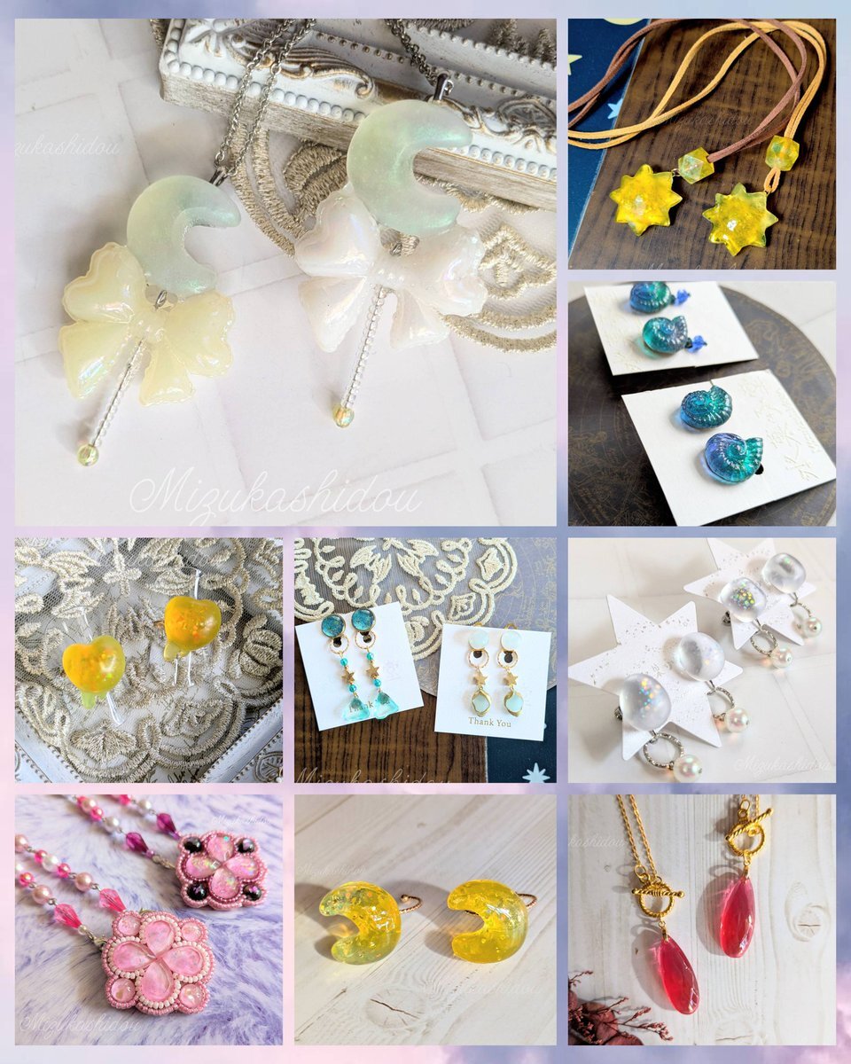 綺麗な色の重なりと煌めき、透明感あふれるアクセサリーを中心に制作しています✨ 天体、魔法のようなきらきらや、水引、手描きのオリジナルイラストを使ったアイテム等🌙*· ✦SHOP✦ minne.com/@mizukashidou thanks♡@Lupopo_cafe 様 #ぼっち企画展 pic.x.com/gxpODntByj