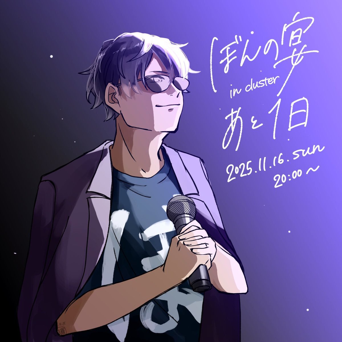 『ぼんの宴🍆 in cluster』 いよいよ本日 11月16日(日)20:00 開催だー! こういうライブイベントは初めて✨ どんな感じになるんだろ?楽しみです(^^♪ 緊張してるだろうな~🤭 #ぼんの宴 #cluster #ぼんさん何してんすか pic.x.com/YW5m9L1WSu