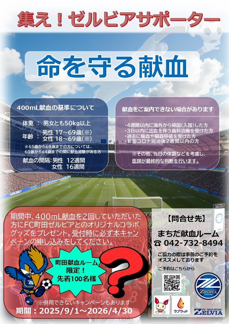 まちだ献血ルーム限定!ゼルビアコラボキャンペーン実施中⚽ 400mL献血ご協力の方でご希望の方に引換券をお渡しします🎫引換券は先着100名様限定です‼️ その引換券を持って、期間中にもう一度400mL献血にご協力いただけますと #ゼルビア と #まちだ献血ルーム コラボグッズをプレゼント🎁 pic.x.com/XfvHqfdYgR