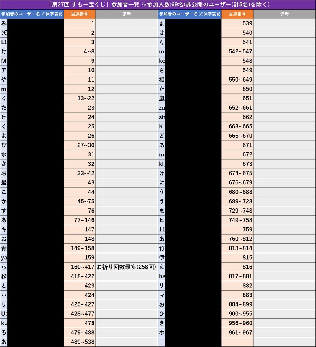 【第27回 #すもー宝くじ(参加者一覧 ※伏字表記)】69名のユーザーが参加しました✨ ご参加いただき、ありがとうございます!! この後、午前7時半頃より、当選者発表を行います🎊 ※今回の賞金(#すもー)は、ALTを参照。 #相模大野ディスカバリー #まちのコインすもー #まちのコイン #相模原市 #相模原 x.com/ohno_discovery…