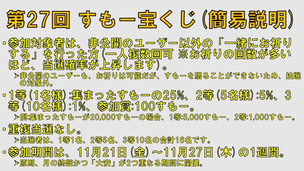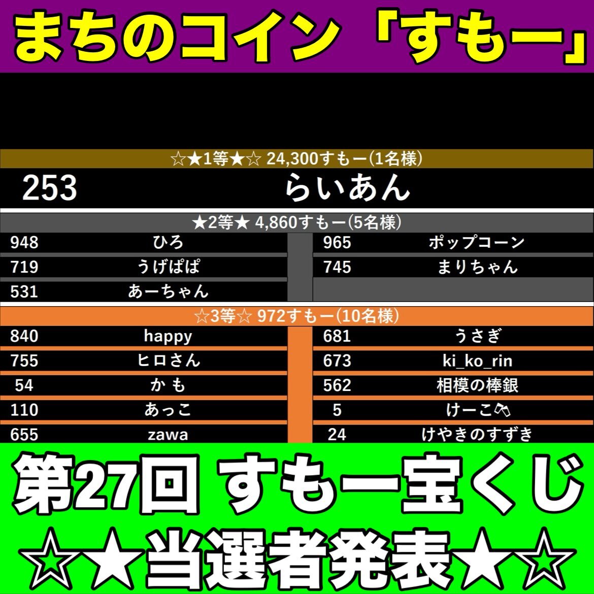 【第27回 #すもー宝くじ(当選者発表)】今回の当選者です🎊 おめでとうございます🎉 1日の配布上限が1万 #すもー の関係上、配布の完了は、来月3日(水)の予定です✨ ALTに、配布のスケジュールなどを記載しました📝 #相模大野ディスカバリー #まちのコインすもー #まちのコイン #相模原市 #相模原 pic.x.com/dPZRNVpkyK x.com/ohno_discovery…