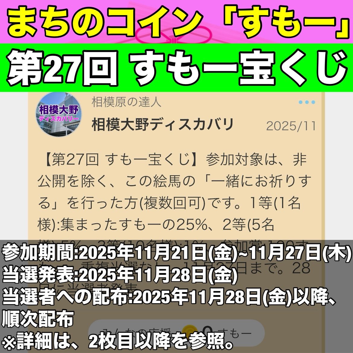 【第27回 #すもー宝くじ】町おこしアプリ「#まちのコイン」の #相模原市 版「#すもー」を利用した企画です✨ 当選者には、すもーを配布します😸 是非、参加してください!! これからインストールする方も大歓迎です😹 今月27日(木)までです✨ #相模大野ディスカバリー #まちのコインすもー #相模原