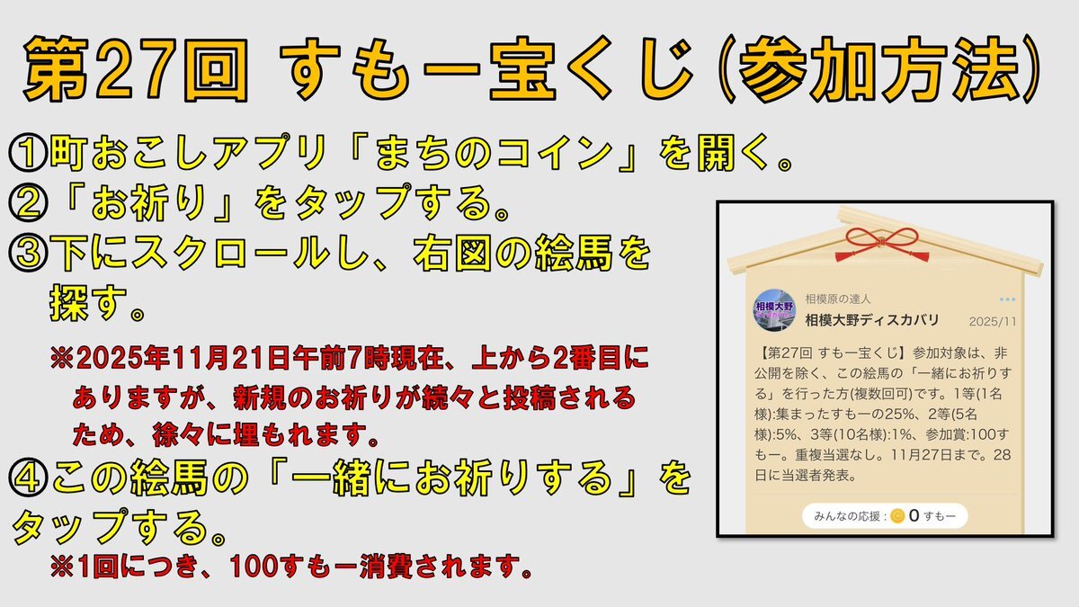 【第27回 #すもー宝くじ】町おこしアプリ「#まちのコイン」の #相模原市 版「#すもー」を利用した企画です✨ 当選者には、すもーを配布します😸 是非、参加してください!! これからインストールする方も大歓迎です😹 今月27日(木)までです✨ #相模大野ディスカバリー #まちのコインすもー #相模原 pic.x.com/FtMa7SVv7a