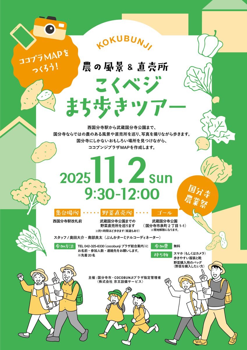 【ココプラ通信】農の風景&直売所 こくベジまち歩きツアー電話申込受付中。 西国分寺駅から武蔵国分寺公園まで国分寺ならではの農のある風景や直売所を巡り、写真を撮りながら歩き、ココブンジプラザMAPを作成します。 詳細はcocobunji-plaza.com/event/ #ココブンジ #国分寺市 #こくベジ #まち歩き pic.x.com/s3ufBNF5Od