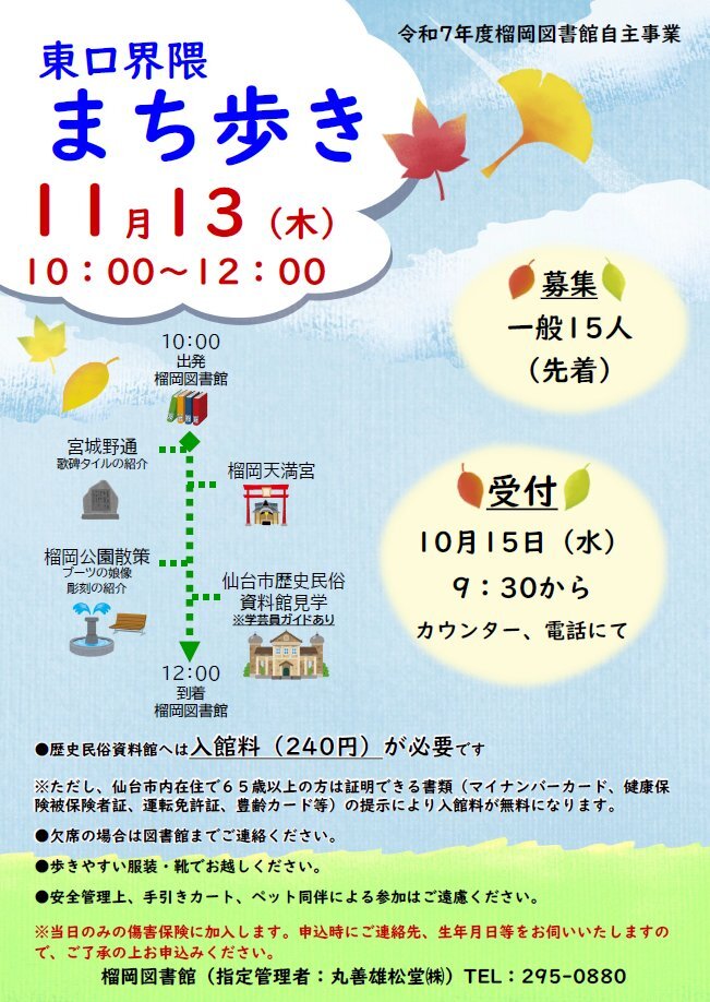 【#榴岡図書館 #まち歩き】 11/13(木)午前10時から12時まで、東口界隈まち歩きを実施します。榴岡図書館から榴岡公園まで歌碑などをめぐります。まだ定員に空きがありますので、ご興味のある方はお早めにお申込みください。申込みは榴岡図書館まで。詳細は画像をご覧ください。#仙台市図書館 pic.x.com/64d5YYTzE9
