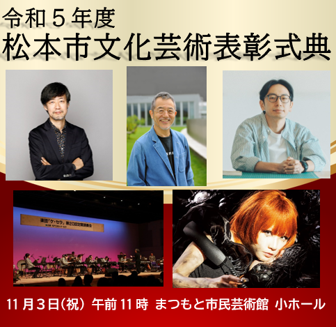 【松本市文化芸術表彰式典の観覧者を募集します】 〇日程:11月3日(祝)午前11時~ 〇場所:まつもと市民芸術館 〇申込:11月1日までにホームページから city.matsumoto.nagano.jp/site/e-shinsei… #まつもと市民芸術館 #ゴジラ #楽団ケ・セラ #シナぷしゅ #第六感 pic.x.com/HwLyU6xNla