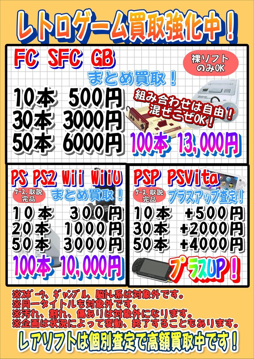 【まとめ買取情報】 レトロゲームソフトのまとめ買取始めました!多く持ってくれば来るほどお得に高く買取しちゃいます! 詳しくは店頭にてご確認ください #買取 #FC #SFC #PS #PS2 #GB #GBA #DS #3DS #PSP #PSVita #レトロゲーム #まとめ買取 #千葉鑑定団 #東金店 pic.x.com/Jgt8wcXkYG