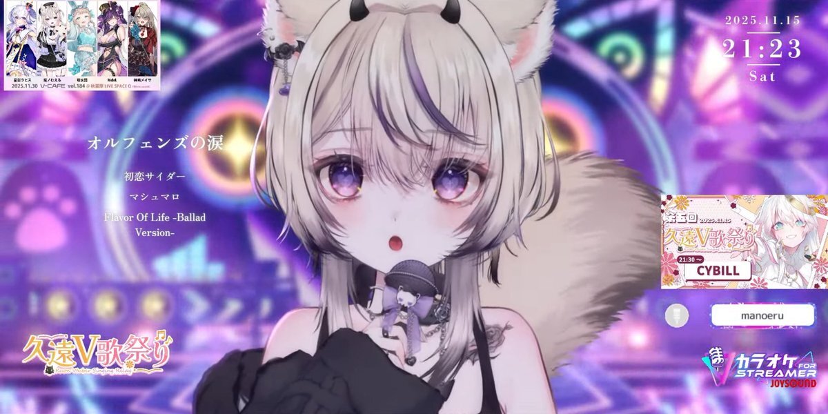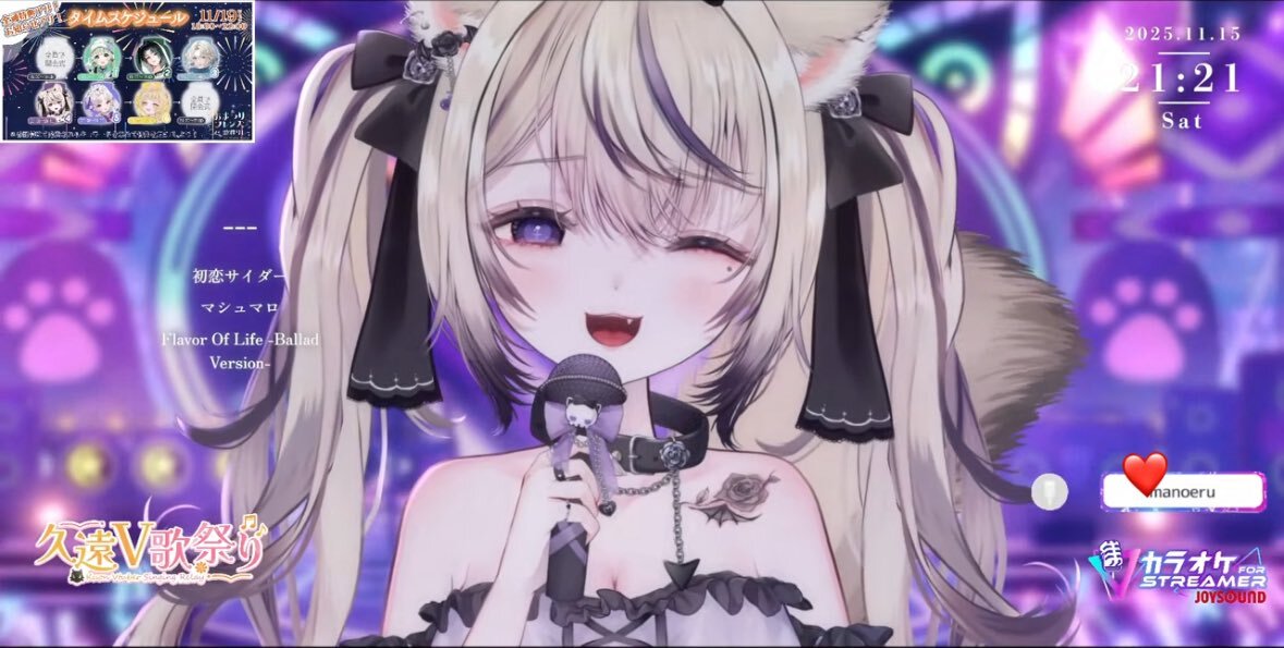おつまのでした! 初出しのマシュマロとってもかっこ良かった! 「Flavor Of Life」と「オルフェンズの涙」の惹き込まれる歌声もとっても素敵でした。 短い時間でも素敵な歌声を届けてくれてありがとう。 初恋ライダーのリベンジも楽しみにしてますね。 #まのちらいぶ #第5回久遠V歌祭り pic.x.com/vE9Lek3PMf
