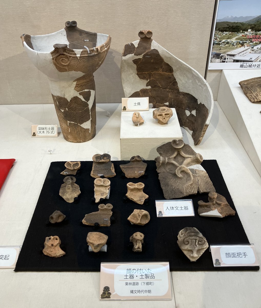 下郷町栗林遺跡出土の人面の付いた土器や土製品。 4⃣の土偶の右側は↓リンクの柳津町池ノ尻遺跡出土樽型土器の土偶装飾の顔に結構似ているかも。土器に付いていた土偶装飾かも知れません。🤔 x.com/YoshiHR2/statu… #まほろんのニューフェイスたち #まほろん pic.x.com/LGDrOgnR0G