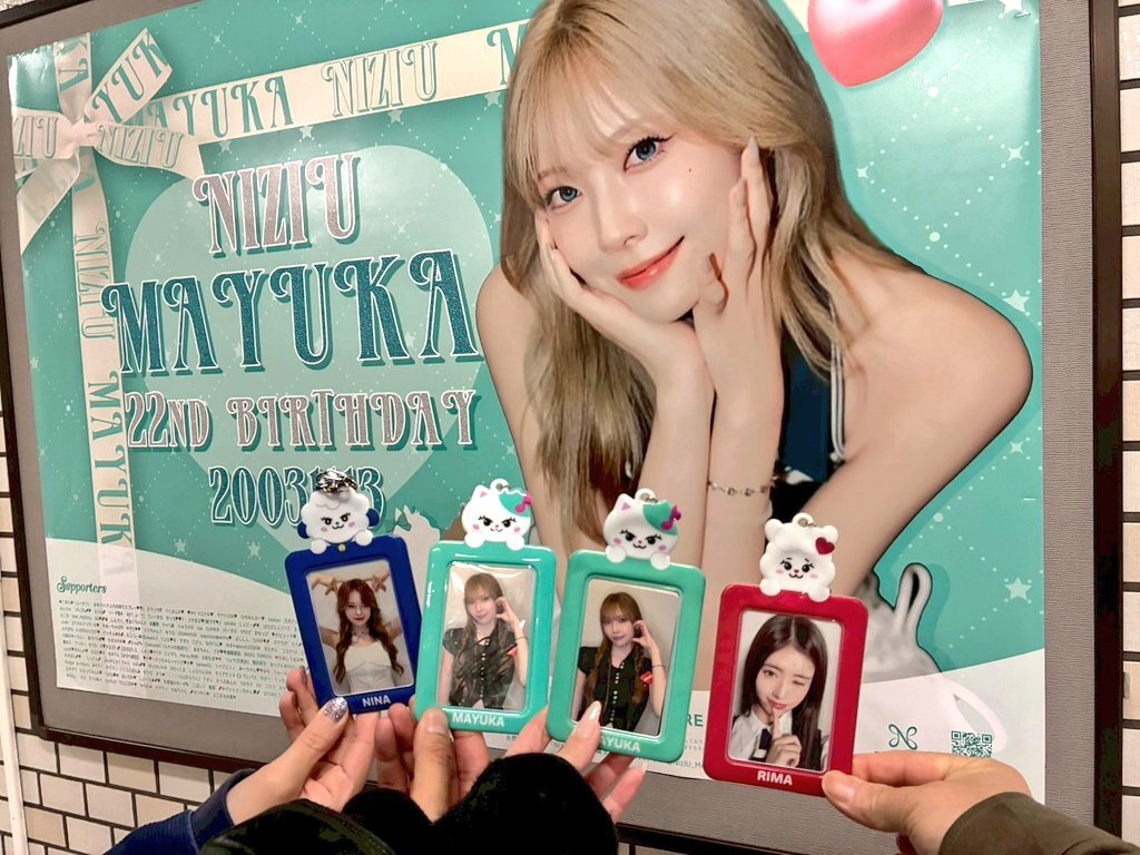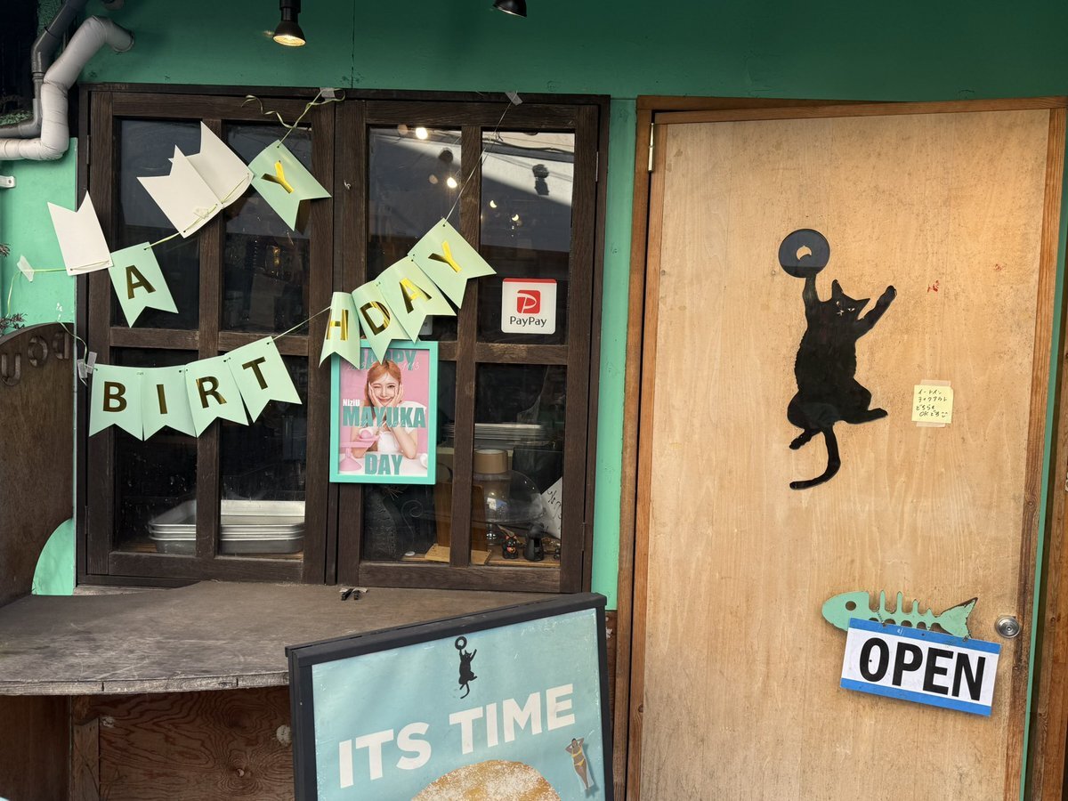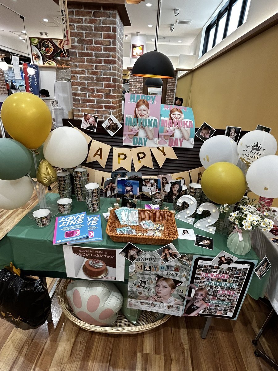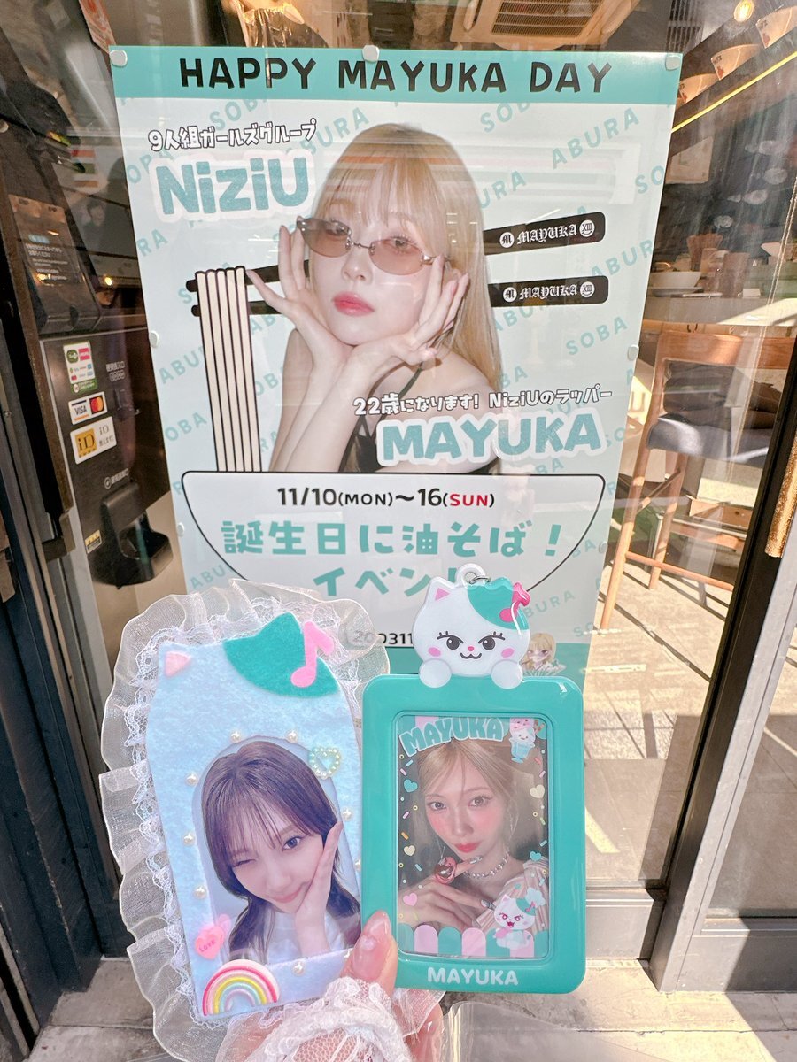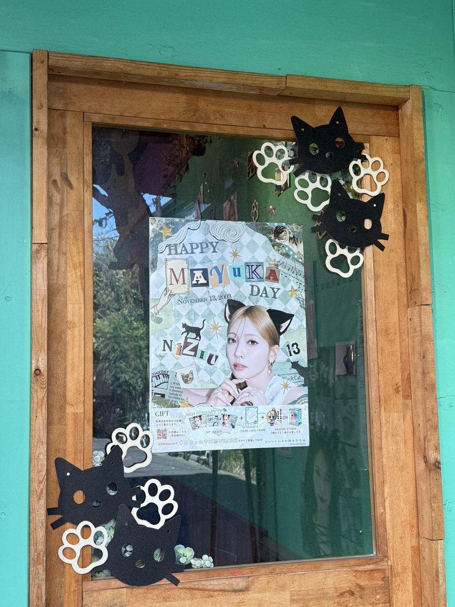 マユカセンイルウィークまだまだ続いております‼️全国各地のカフェや広告をお楽しみください🐱💚 一部特典終了してしまったイベントもございますが、引き続き装飾等マユカちゃんで溢れた店内になっていますので足を運んでみてください🐾 #HappyMAYUKADay #まゆちのハート掴めばWinner x.com/niziu_mayukada…